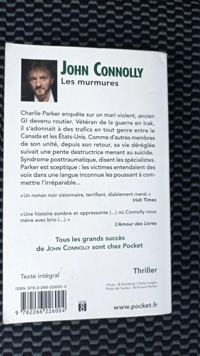 livre poche John connolly les murmures Résumé : Charlie Parker enquête sur un mari violent, ancien GI devenu routier. Vétéran de la guerre en Irak, il s'adonnait à des trafics en tout genre entre le Canada et les États-Unis. Comme d'autres membres de son unité, depuis son retour, sa vie déréglée suivait une pente destructrice menant au suicide. Syndrome posttraumatique, disent les spécialistes. Parker est sceptique : les victimes entendaient des voix dans une langue inconnue les poussant à commettre l'irréparable... très bon état général #sylvaine88livres #roman #fantastique #fantasy #policiers #polars #romannoir #suspense #thriller #fantastique #sciencefiction #guerre #détective #étatsunis #littératureaméricaine N'hésitez pas à regarder l'ensemble de mon dressing je fais -20% sur les lots