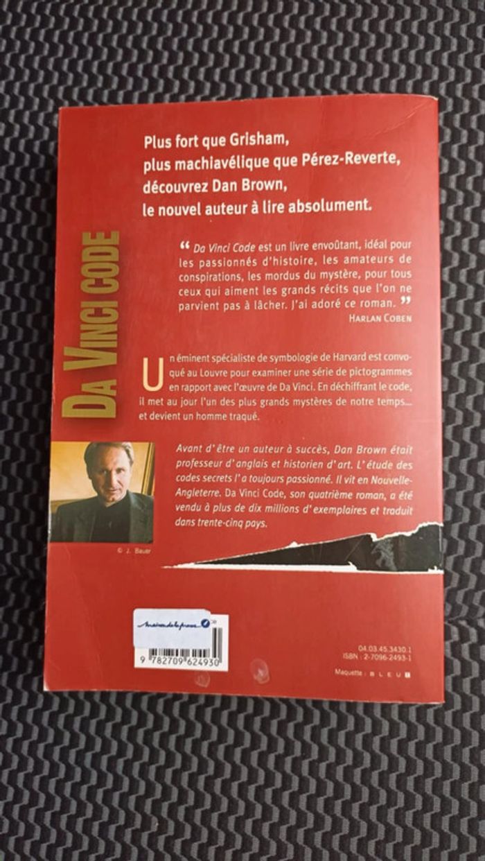 vends livre roman broché Da vinci code Dan Brown Résumé : Robert Langdon, un éminent spécialiste de symbologie de Harvard, est convoqué d’urgence au Louvre. On a découvert un message codé sur le cadavre du conservateur en chef, retrouvé assassiné au milieu de la Grande Galerie. Pour examiner la série de pictogrammes, il est épaulé par Sophie Neveu, une brillante cryptographe membre de la police. À leur grande surprise, les premiers indices les conduisent à l'œuvre de Léonard de Vinci. En déchiffrant le code, Langdon va mettre au jour l'un des plus grands mystères de notre temps... et devenir un homme traqué. très bon état: marque de pliure du à la lecture sur la tranche et un étiquette collée #sylvaine88livres #roman #fantastique #aventure #historique #thriller #ésotérique #policiers #polars #suspense #énigmes #adapté #cinéma #enquêtes #mystère #secrets #complots #Paris #religion #ésotérisme #littérature américaine N'hésitez pas à regarder l'ensemble de mon dressing je fais -20% sur les lots