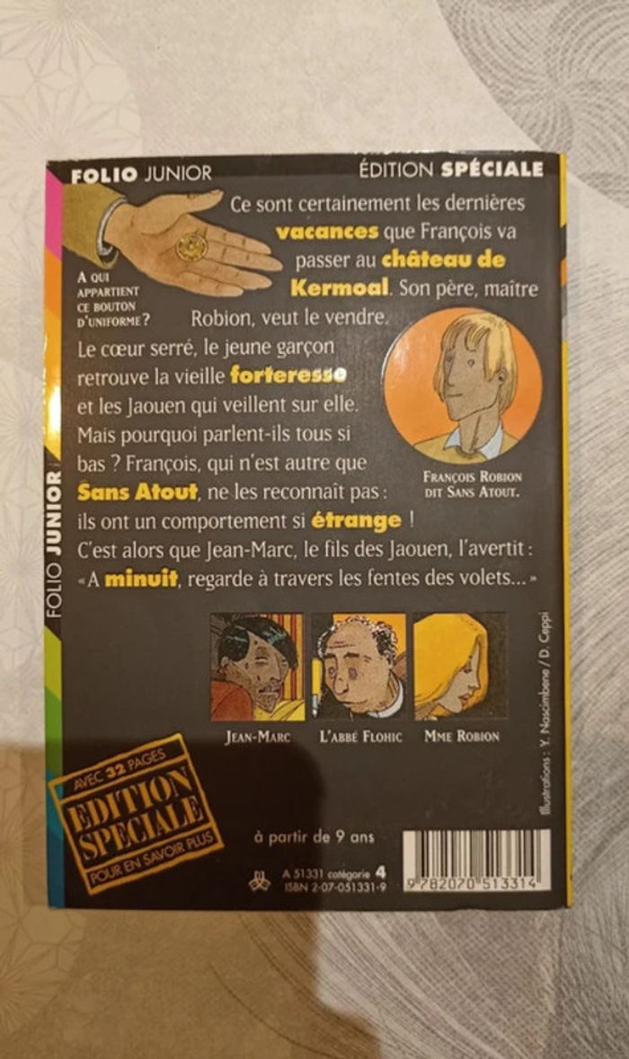 Vends livre de poche Sans Atout et le cheval fantôme Boileau-Narcejac Edition folio junior Sans Atout mêne l'enquête et nous entraîne dans une aventure palpitante et rocambolesque ! Avec tout l'art du suspense et de l'intrigue de Boileau-Narcejac. Ce sont certainement les dernières vacances que François, dit Sans Atout, va passer au château familial de Kermoal. Son père, l'avocat maître Robion, veut le vendre. Le cœur serré, le jeune garçon retrouve la vieille forteresse et les Jaouen qui veillent sur elle. Il ne les reconnaît pas : ils ont un comportement si étrange! Pourquoi parlent-ils tous si bas? Sans Atout sent planer un mystère. C'est alors que Jean-Marc, le fils des Jaouen, l'avertit : «À minuit, regarde à travers les fentes des volets…» A partir de 9 ans bon état général #sylvaine88livres #livre #enfant #jeunesse #lecture #folio #junior #Aventure #Cheval #Fantastique #Fantôme #Mystère #Roman #policier #9ans #sansatout #enquêtes #enfance #littératurefrançaise #bretagne #moyen-âge N'hésitez pas à regarder l'ensemble de mon dressing je fais -20% sur les lots