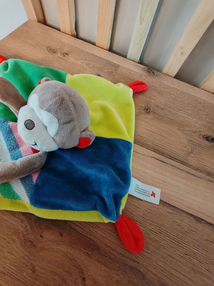Doudou plat singe NICOTOY Woodstock bleu vert rayures multicolores en laine Tbe Étiquette marque présente 16 euros Envoi en relais