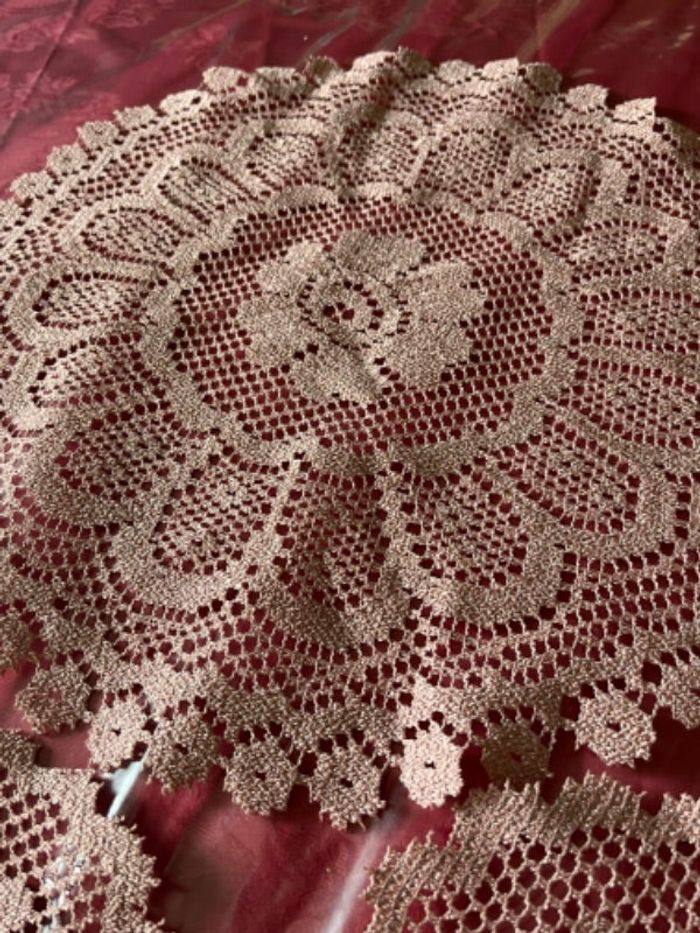 Set de 5 napperons fait main au crochet par mes soins le set contient un grand napperon de 43 cm de diamètre et de 4 napperons de 18 cm de diamètre neuf jamais exposé rose poudré