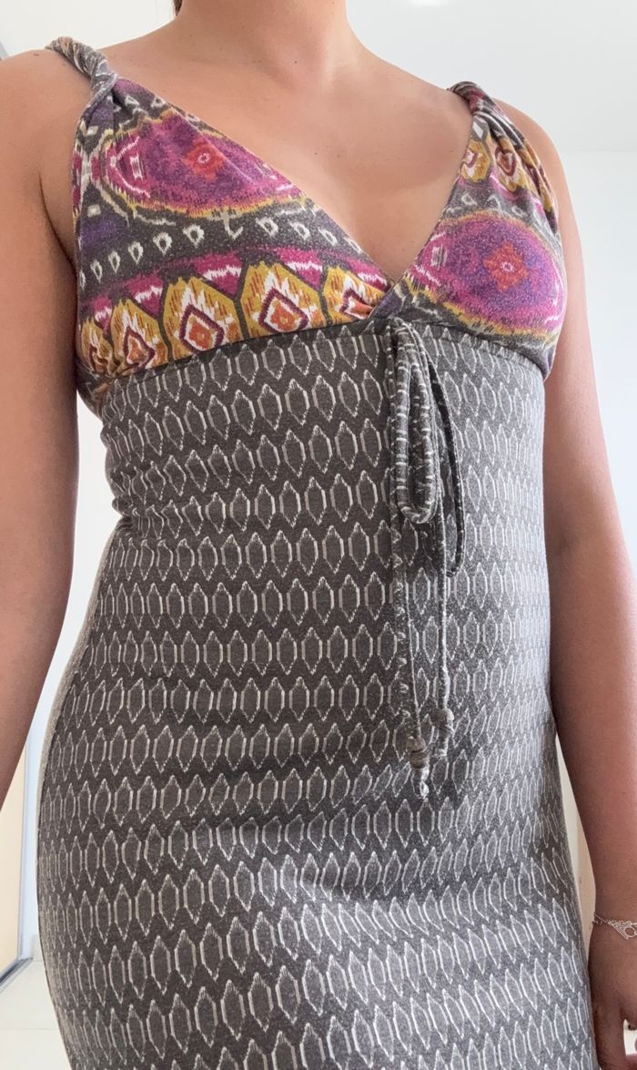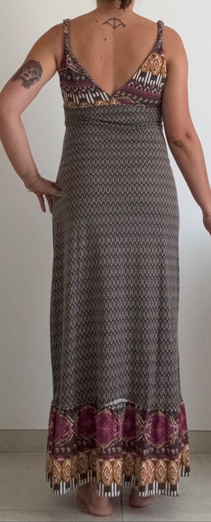 Magnifique robe longue style bohème signée Pimkie, parfaite pour l’été. Buste ajusté avec jolis motifs colorés ethniques dans les tons violets, orangés et dorés. Dos légèrement échancré et bretelles enroulées. Tissu fluide et extensible, très confortable à porter ☀️ 📏 Taille M (peut aussi convenir à un S grâce à l’élasticité du tissu). Très bon état général, aucun défaut visible. Prix négociable 💰