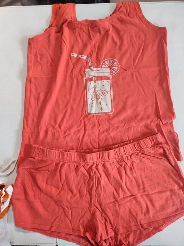 Pyjama été rose corail short et débardeur " coktail bar ". Taille M 38-40. Kiabi. En très bon état. Photo de l'intérieur de l'entrejambe propre.