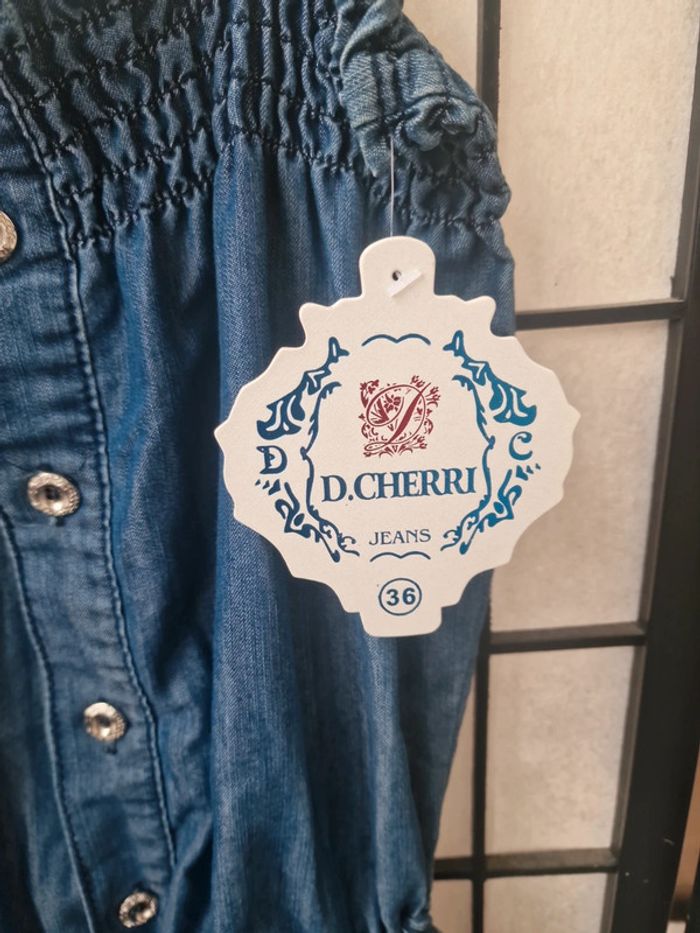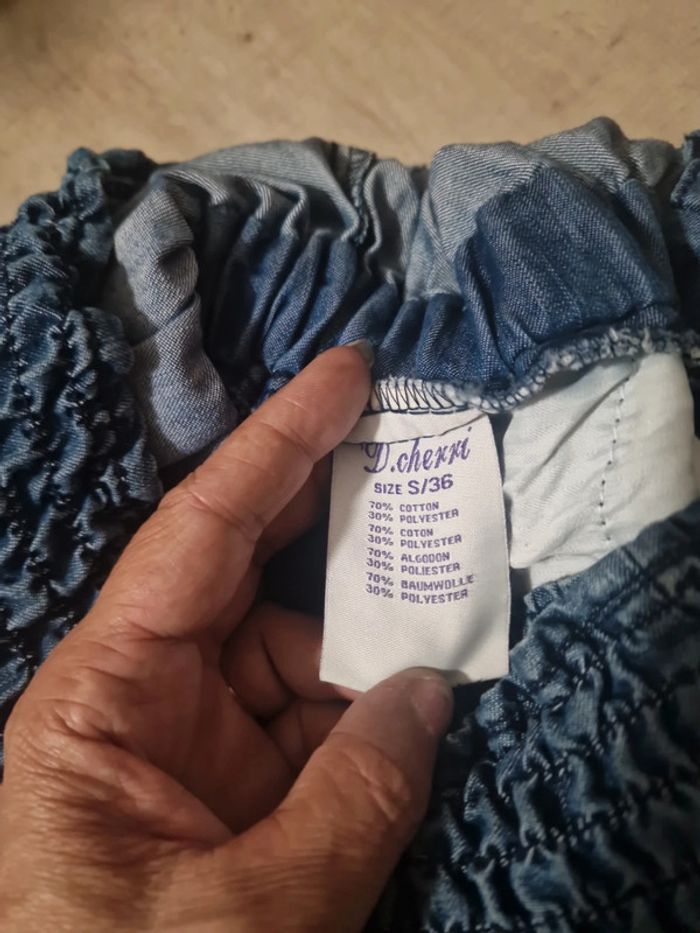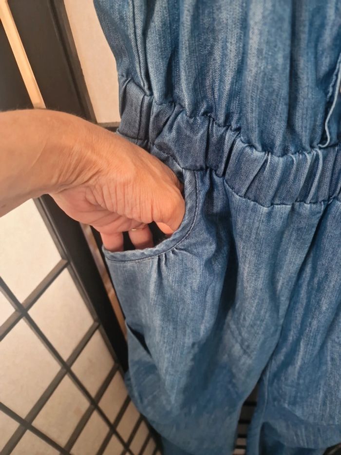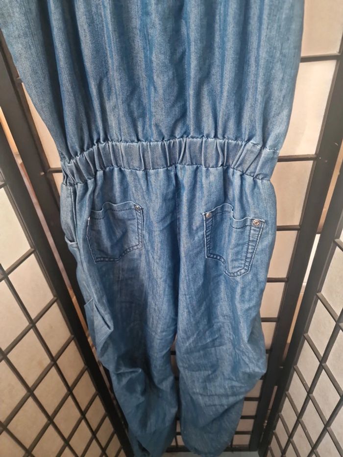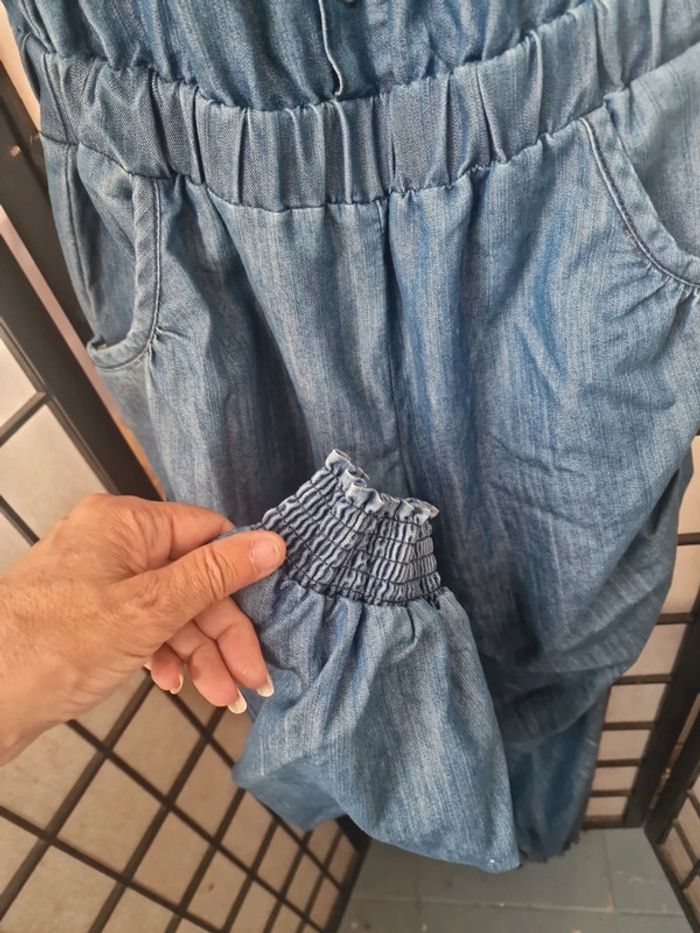 Tres jolie combipantalon jean, 2 poches devant et 2 derrière, bouton devant, elastique a la taille ainsi qu'aux chevilles, bretelles elastique egalement , smocke tout le tour au dessus de la poitrine , taille S ( élastique jusque 38/40)