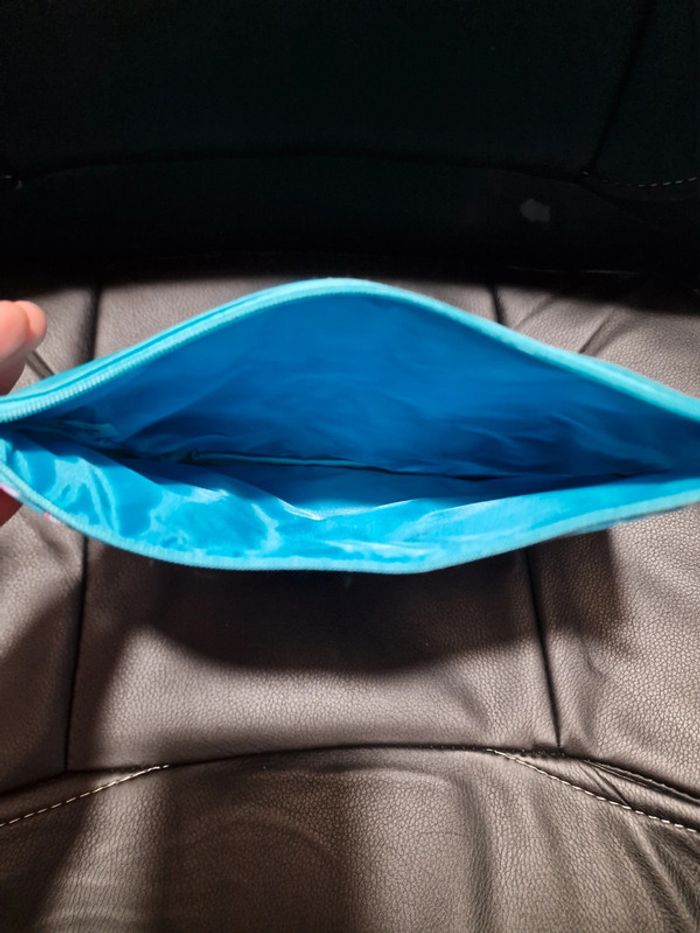 Pochette fleurie de couleur bleu. Peut s'utiliser pour pochette maquillage ou rangements cosmétiques.