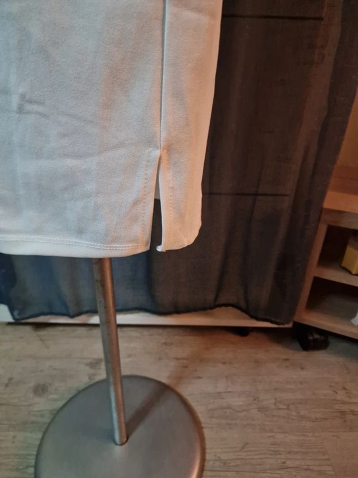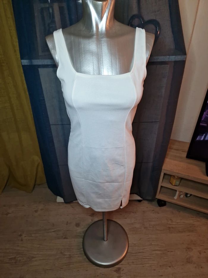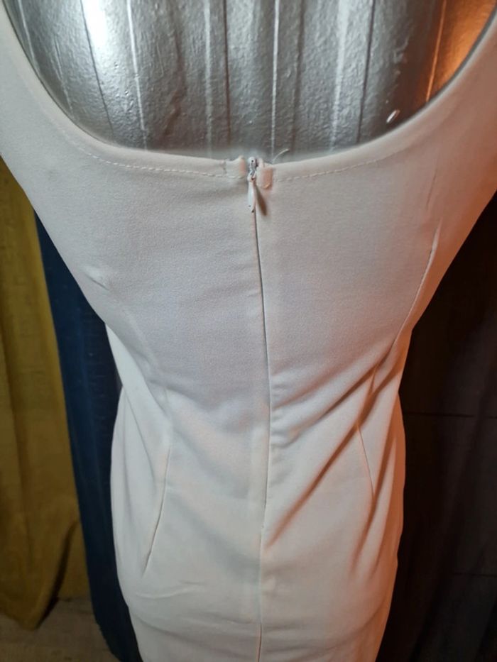 Robe blanche, fermeture par zip derrière, petite fente sur le devant , taille unique elasthane ( va jusque 38)