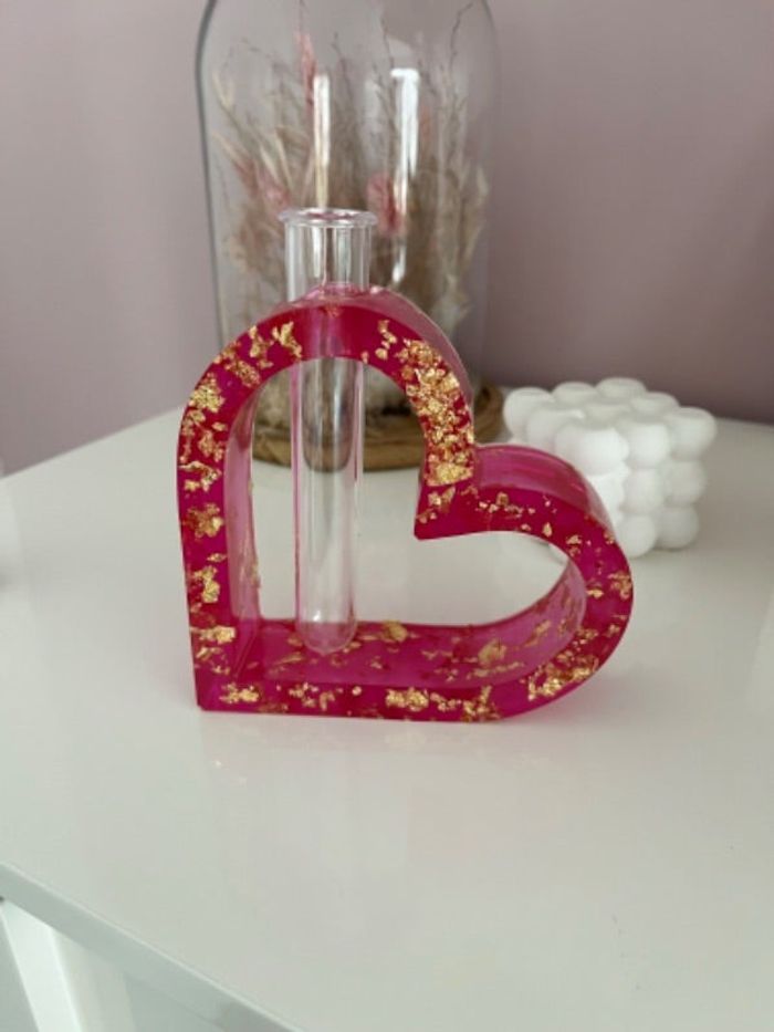 Vase en forme de cœur rose avec feuilles doré et son tube à essai fait main en résine