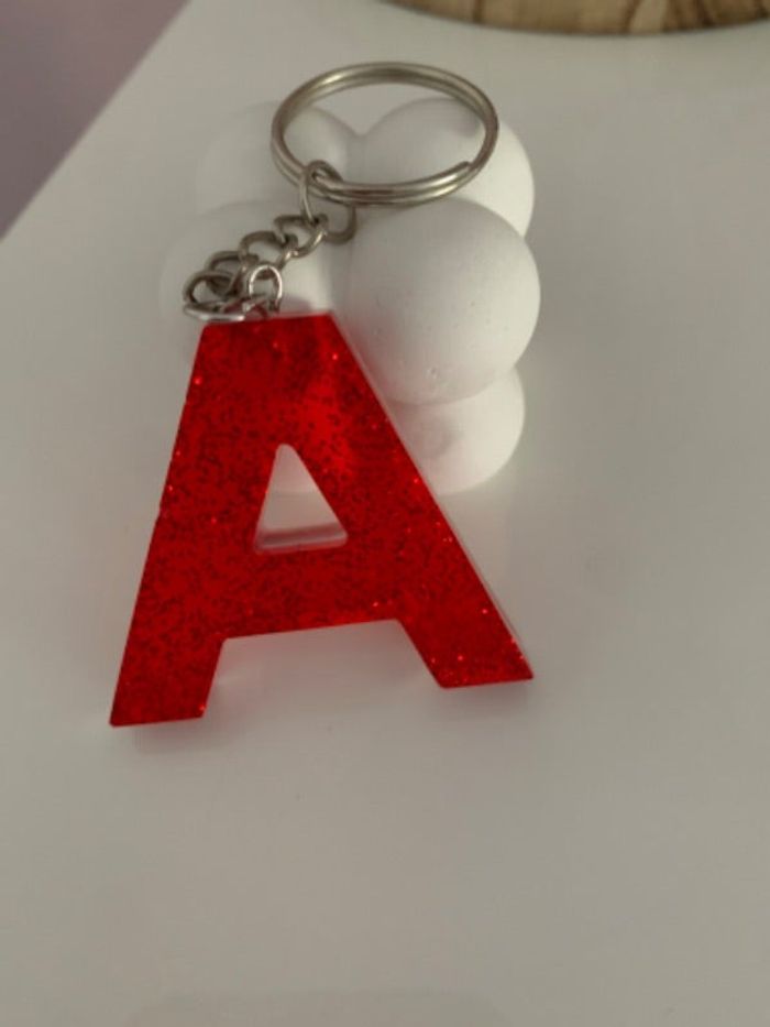 Porte clé lettre A rouge à paillettes fait main en résine