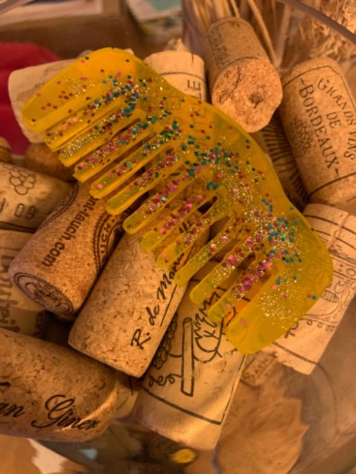 Petit peigne jaune multicolore idéale pour mettre dans le sac à main fait main en résine
