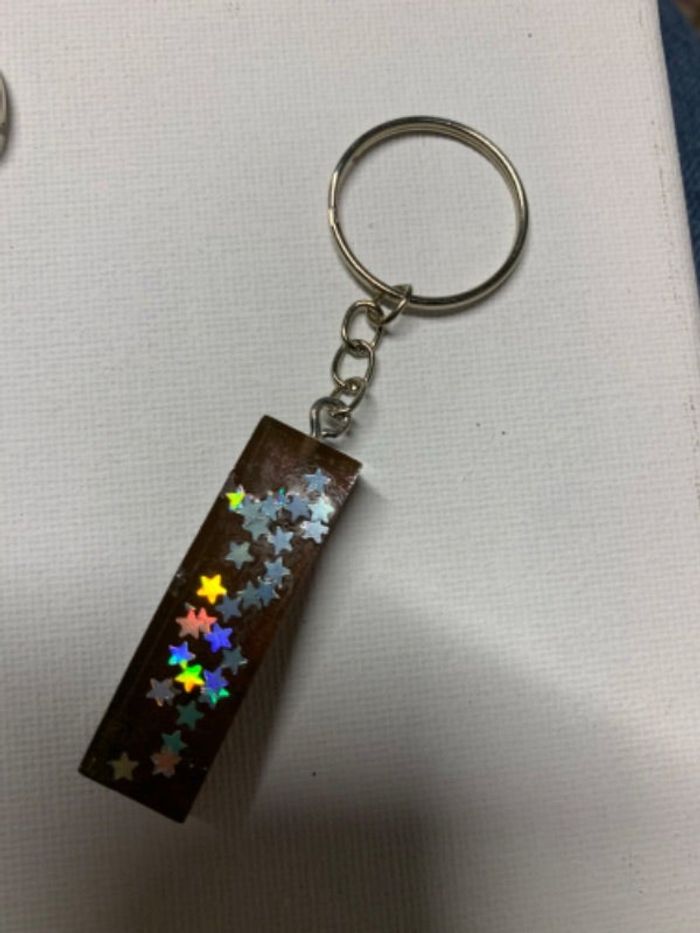 Porte clé lettre I marron à paillettes étoiles argenté fait main en résine neuf