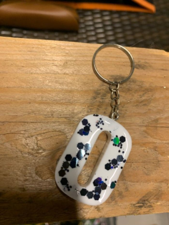 Porte clé chiffre 0 blanc à paillettes noir fait main en résine neuf