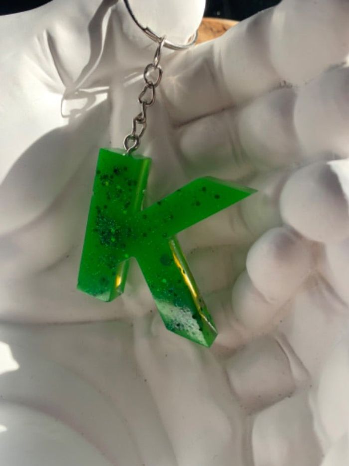 Porte clé lettre K vert et transparent pailletées fait main en résine neuf