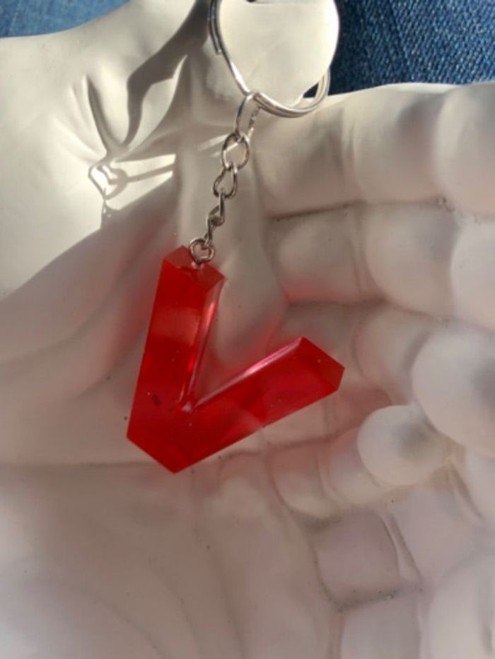 Porte clé lettre V transparent et rouge fait main en résine neuf