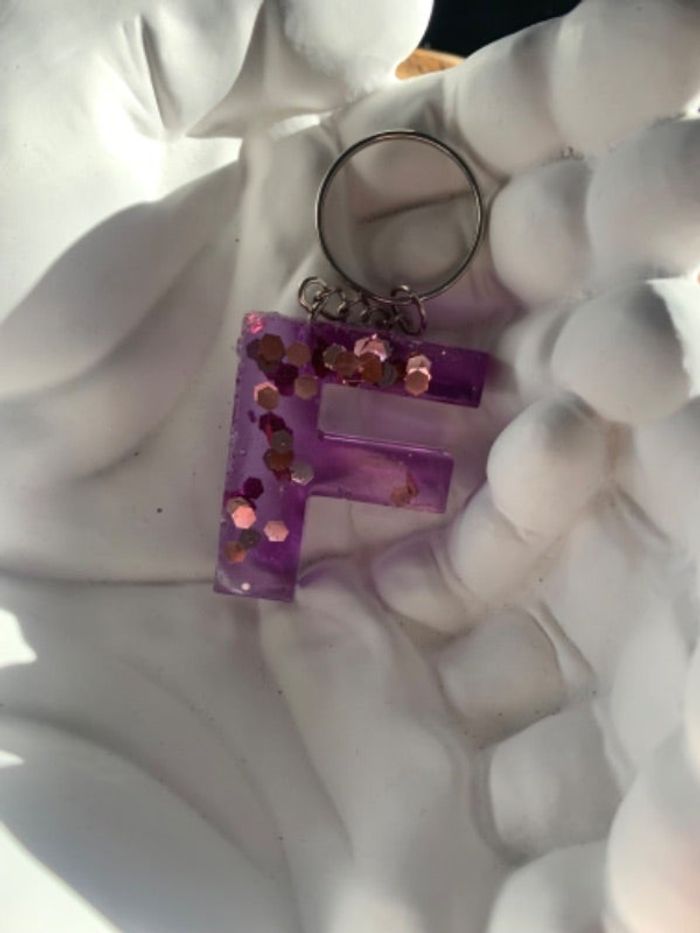 Porte clé lettre F violet à paillettes fait main en résine neuf