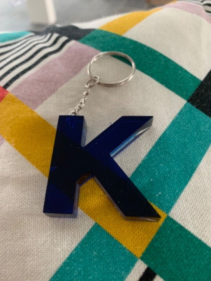 Porte clé lettre K bleu et transparent fait main en résine neuf