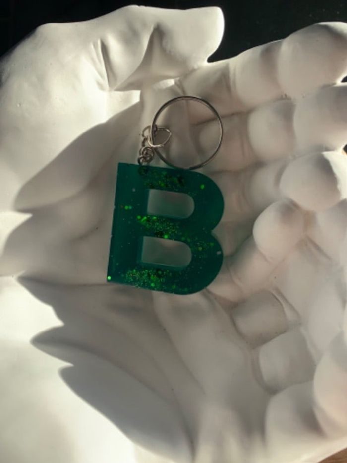 Porte clé lettre B vert à paillettes fait main en résine neuf