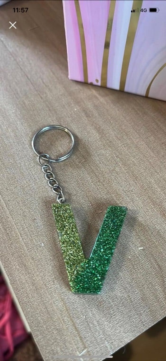 Porte clé lettre V vert à paillettes fait main en résine neuf