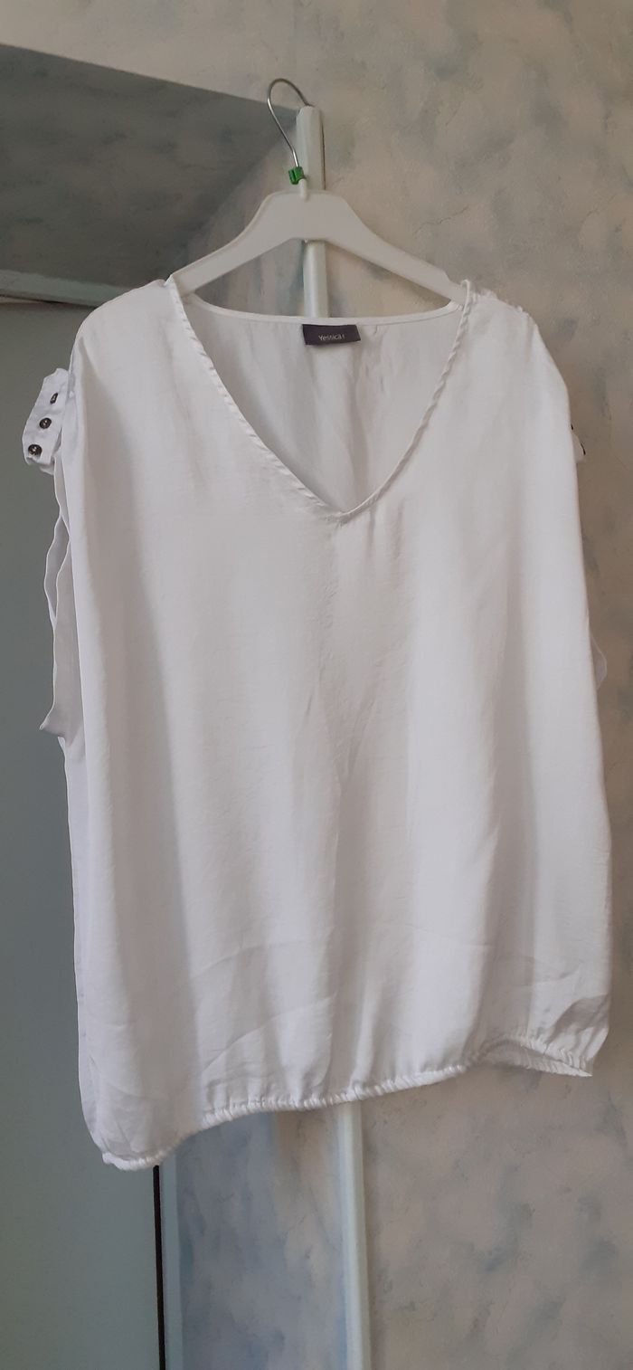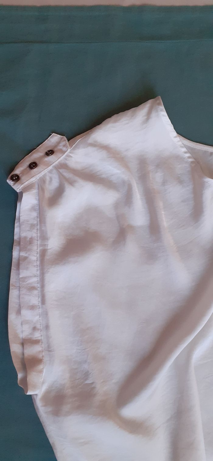 Vends un top en polyester aspect légèrement satiné, sans manche avec épaulettes et 3 boutons sur les épaules, élastique à la base, couleur blanc, marque Yessica, taille 50. Un peu transparent. Longueur de l'épaule à la base : 66 cm Largeur aisselles et hanches : 59 cm.
