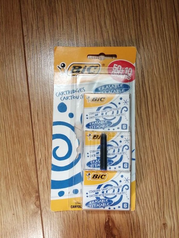 Paquet de petites cartouches d'encre bleue effaçable, de marque Bic, paquet de 55 (à la base il y en avait 60 mais on a utilisé 5 cartouches).
