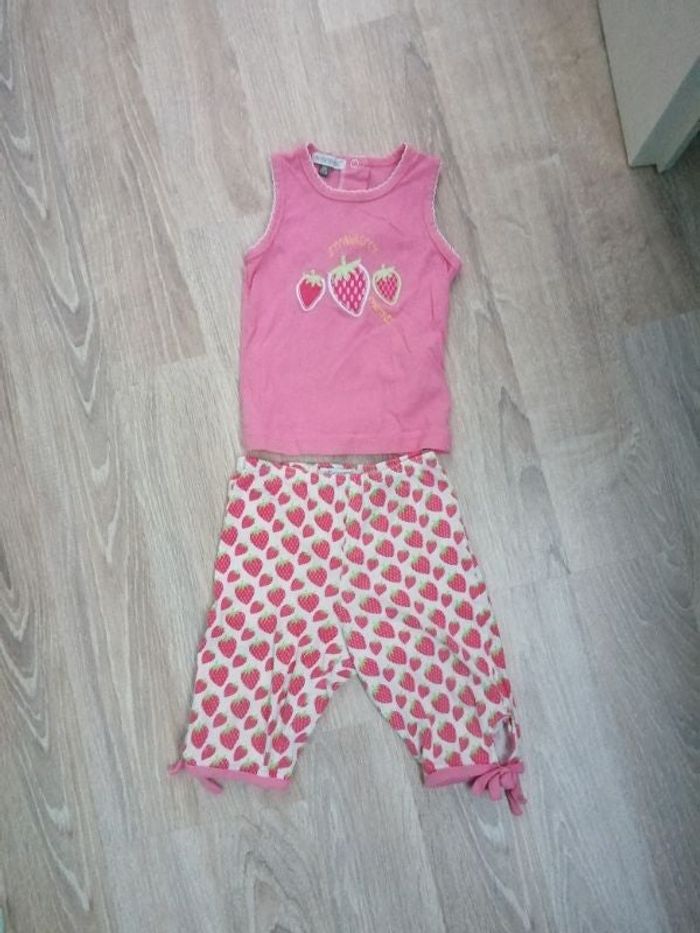 Joli petit ensemble avec pantacourt blanc avec des fraises dessus et le t-shirt rose avec des fraises devant, 3 pressions dans le dos.