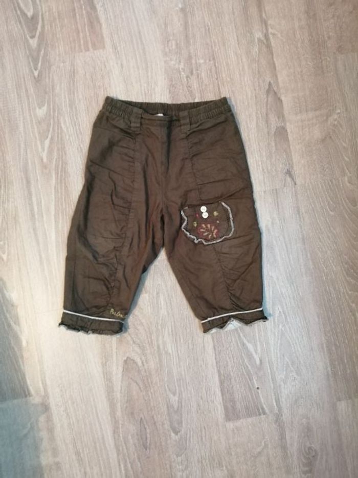 Pantalon kaki avec 1 poche sur la jambe avec 2 boutons et fleur brodée. Taille élastiquée.