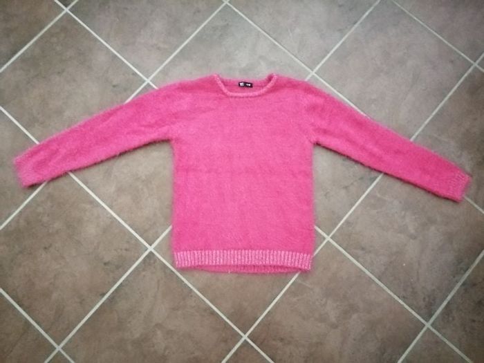 Joli pull rose, tout doux et bien chaud. Des fils argentés au niveau du col, du bas et des poignets. Taille : 11 / 12 ans