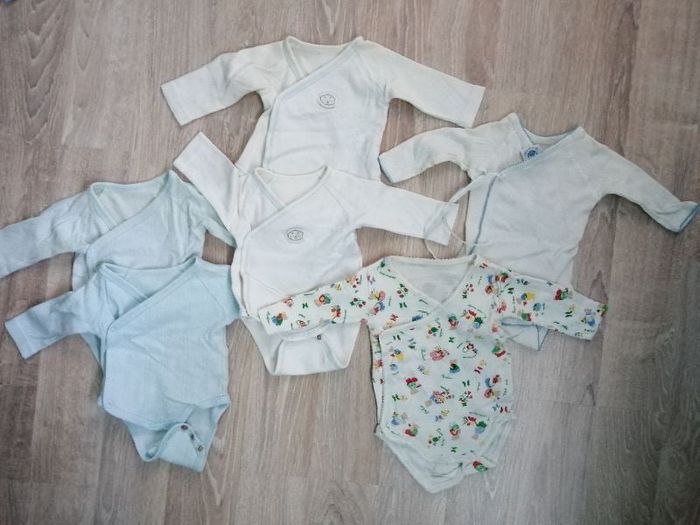 Lot de 6 bodies manches longues, fermé en croisant sur le ventre, pratique pour habiller bébé. 2 bleu, 2 blanc avec 1 tête de nounours, 1 blanc et 1 à motifs.
