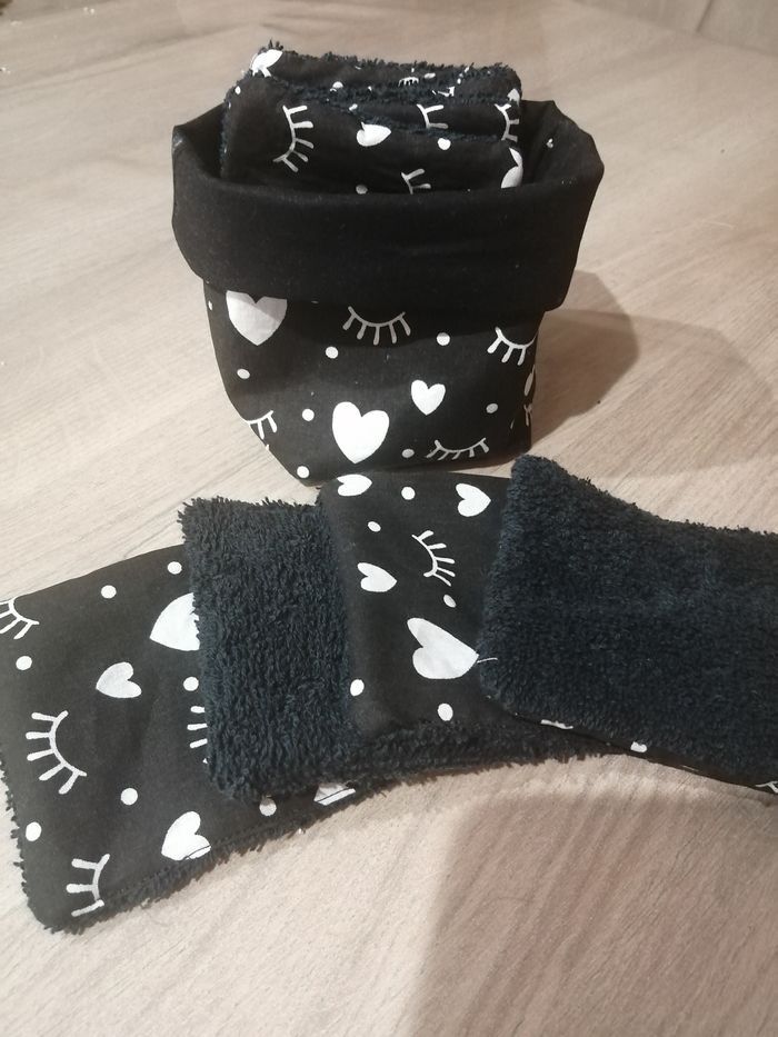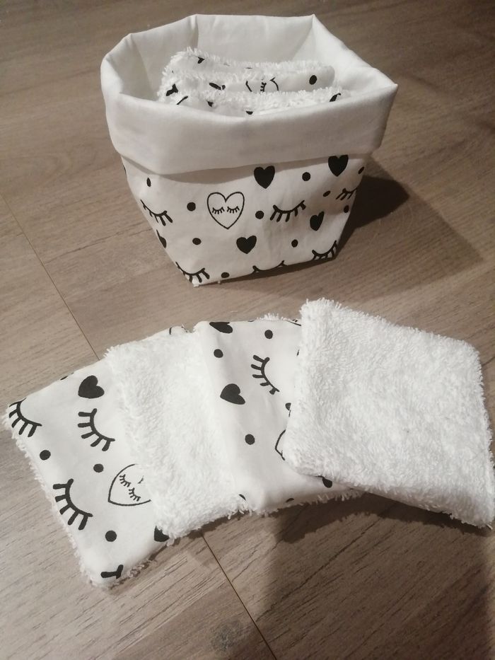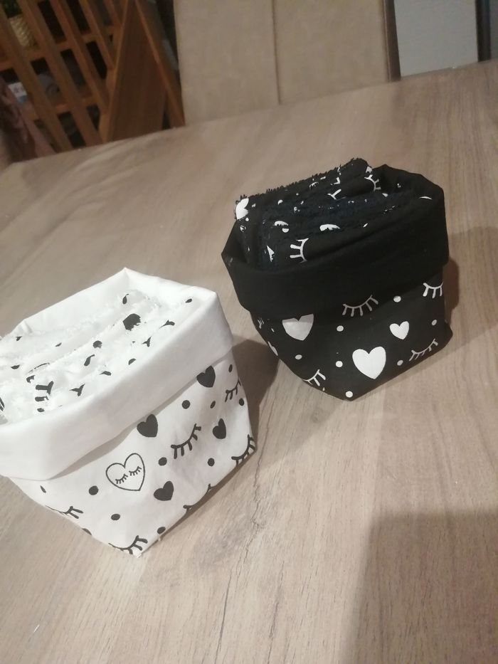 Lot 2 paniers avec 8 lingettes chacune soit 16 lingettes lavables en machine. Tissu coton.