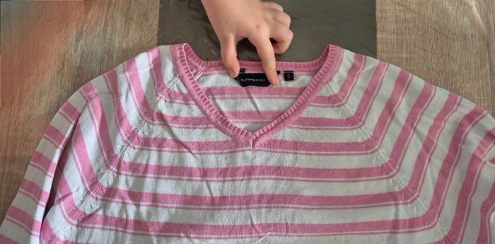 Bonjour Je vends un joli pull léger de la marque 'Cutting edge', idéal pour les demi-saisons. - Marque : Cutting edge - Motif : Rayures horizontales roses et blanches - Col : Col en V - Taille : S - Matière : 100% coton - État : Très bon état, peu porté. Parfait pour un look décontracté et printanier. N'hésitez pas, j'envoie rapidement.x