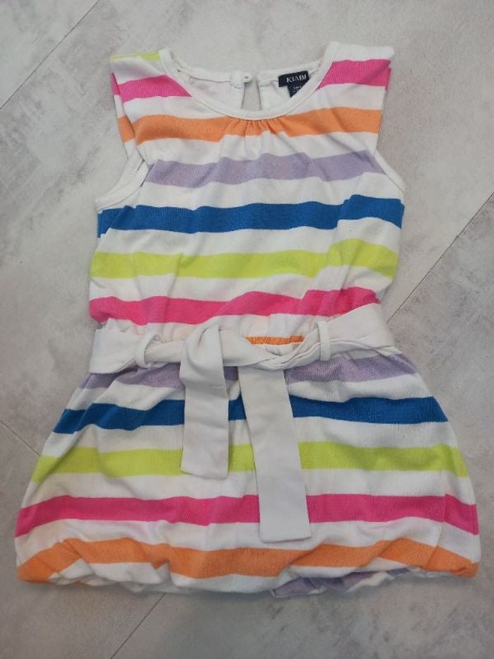 Robe colorée sans manche avec ceinture Attache avec un petit bouton dans le cou 24 mois mais pas très longue donc je conseille plus comme robe autour de 18 mois et comme "tunique" avec un legging par exemple autour de 24 mois Bon état