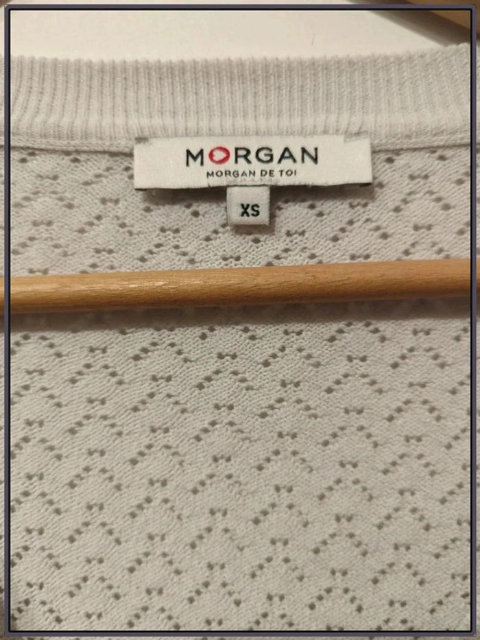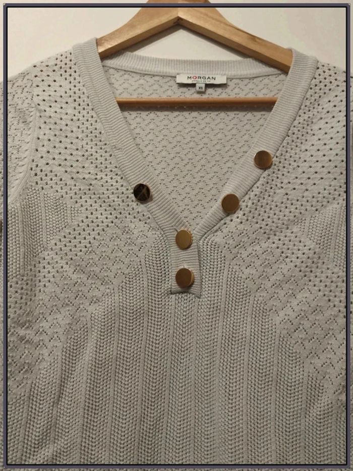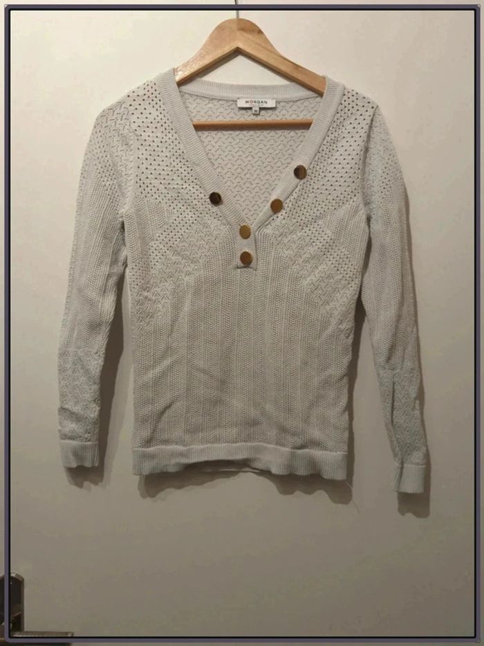 Pull en maille blanc de chez Morgan, avec boutons dorés en déco (manque 1 bouton). En très bon état hormis le bouton manquant.