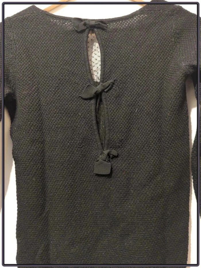 Pull noir / brillant avec noeud dans le dos. Pull qui bouloche, en bon état.