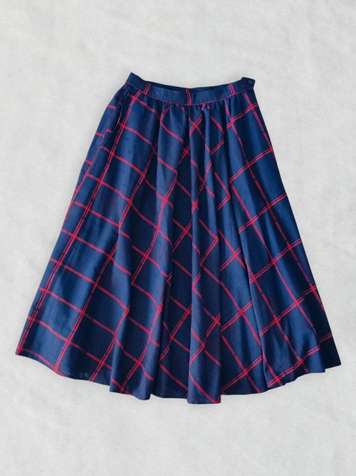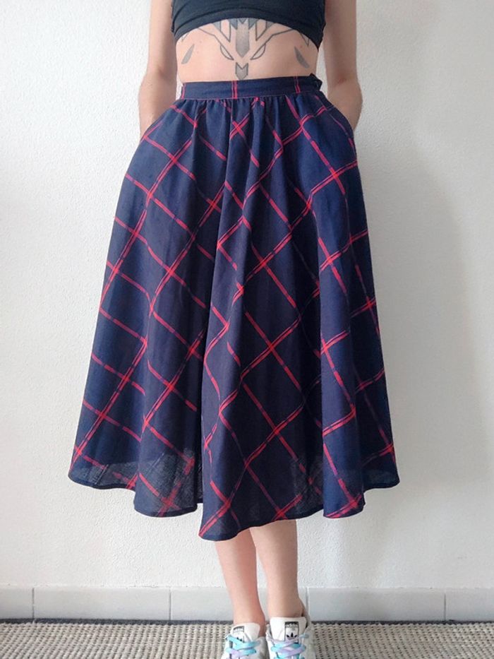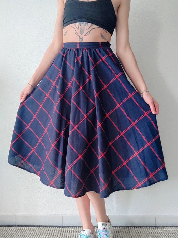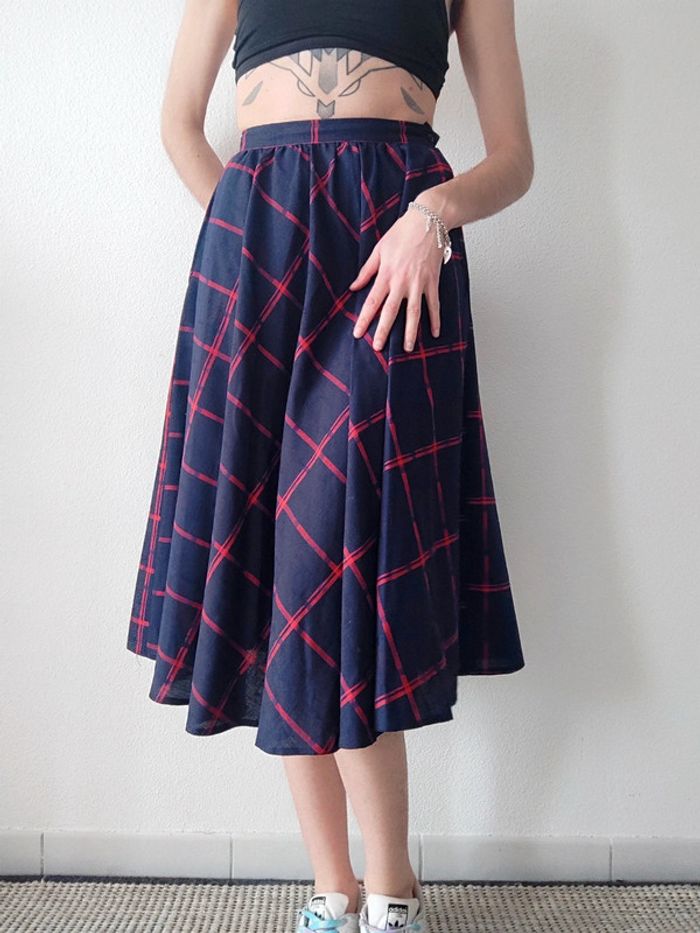 Jupe longue évasée bleu marine tartan rouge vintage 70-80 🇬🇷 34/XS à 36/S - photo numéro 1