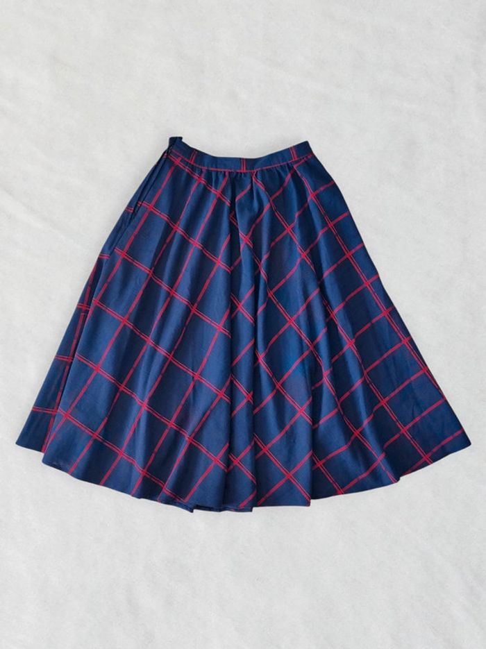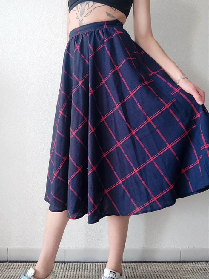 Jupe longue évasée bleu marine tartan rouge vintage 70-80 🇬🇷 34/XS à 36/S - photo numéro 3