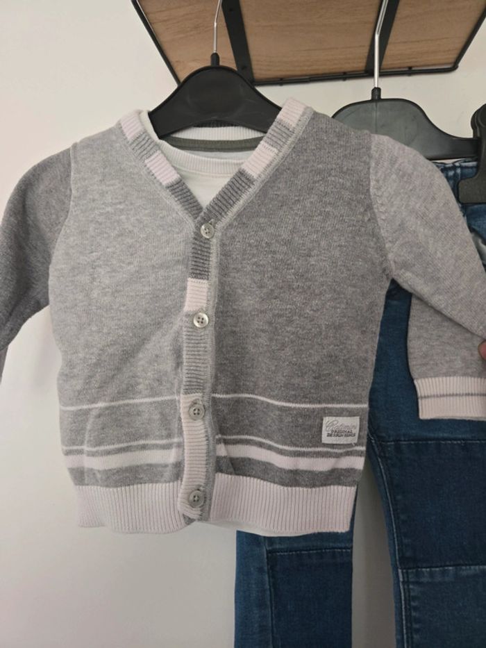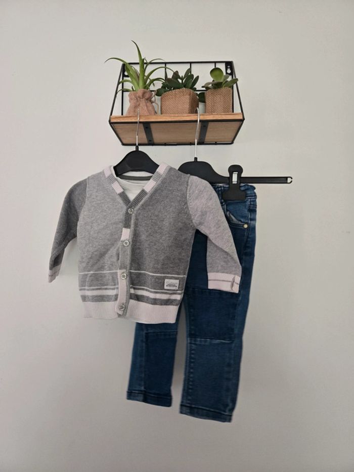 #9moisgarçon_tatianaalena Joli ensemble Marque ◼️ : Kiabi / Catimini / TAO Taille 📏 : 9 mois État 🏷️: t-shirt donné / Gilet Bon état/ Jean tres Bon état Couleur 🎨 : Gris / Blanc / Bleu