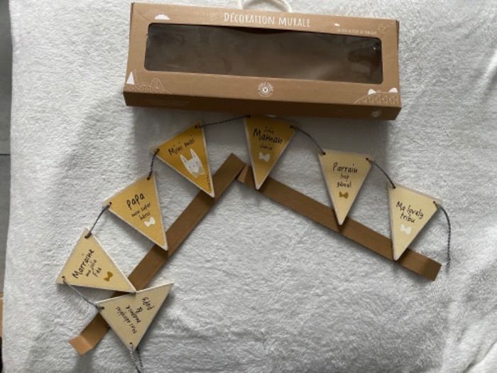 Décoration murale Lovely Tribu. Fabrication française en bois de peuplier français. Adorable fanion généalogique, vous pourrez y accrocher sept photos des membres de la famille. Il permettra à votre enfant d’apprendre à reconnaitre ses proches (papy, mamie, parrain, marraine et vous). Derrière chaque fanion se cache une pince en bois pour clipser les photos. Il pourra accompagner l’enfant pendant une grande partie de sa croissance car il s’agit d’un objet durable. Neuf Valeur magasin : 39€.