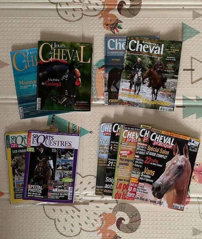Lot de 11 revues équitation / magazine cheval : - 2 sports équestres de 2011 - 5 cheval pratique de 2003,2004,2006 - 2 randonné à cheval de 2011 - 2 jours de cheval de 2014 L’état des magazines et aléatoire mais tout reste lisible. N’hésitez pas à me demander pour avoir plus de détails sur les numéros et les mois.