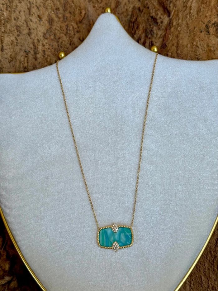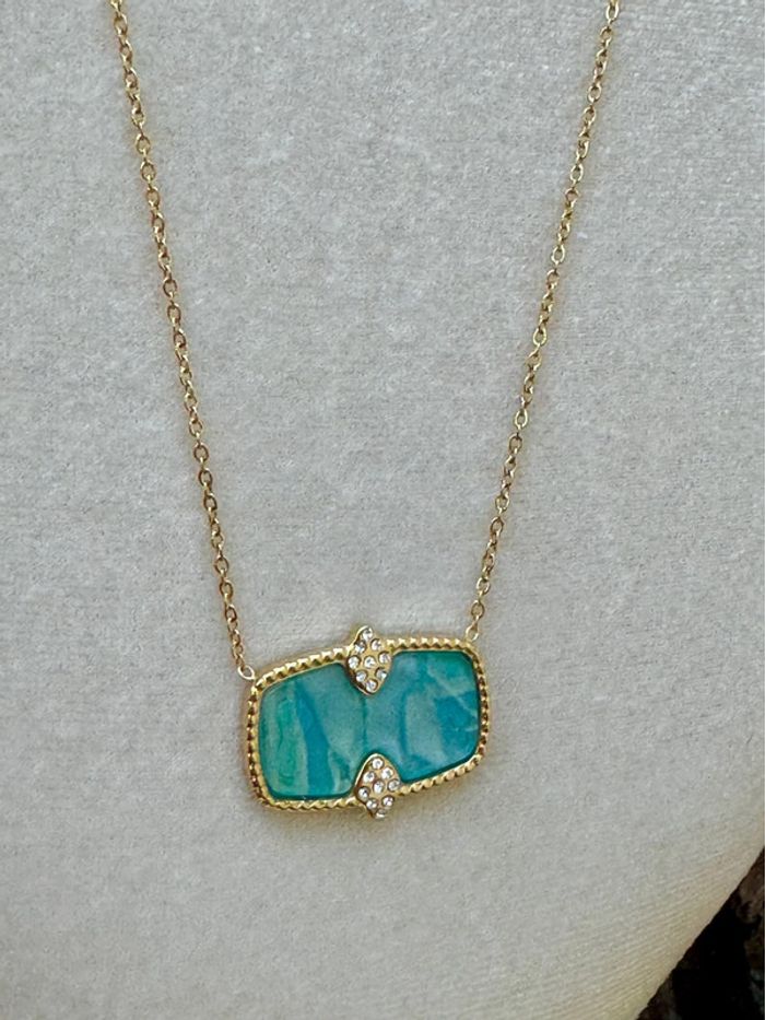 Collier chaîne réglable acier inoxydable or plaque rectangle résine turquoise cristaux - photo numéro 1