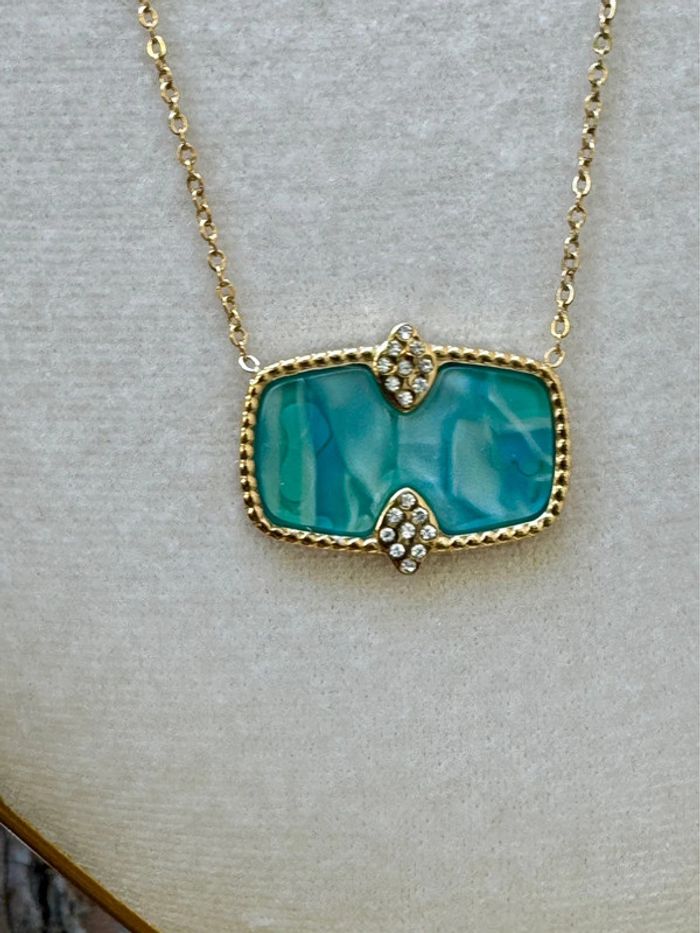 Collier acier inoxydable or réglable plaque rectangle résine turquoise avec des reflets et cristaux neuf dans pochon