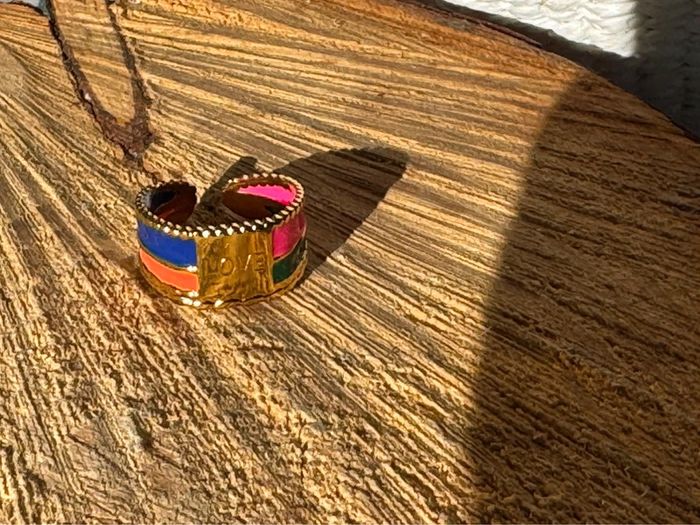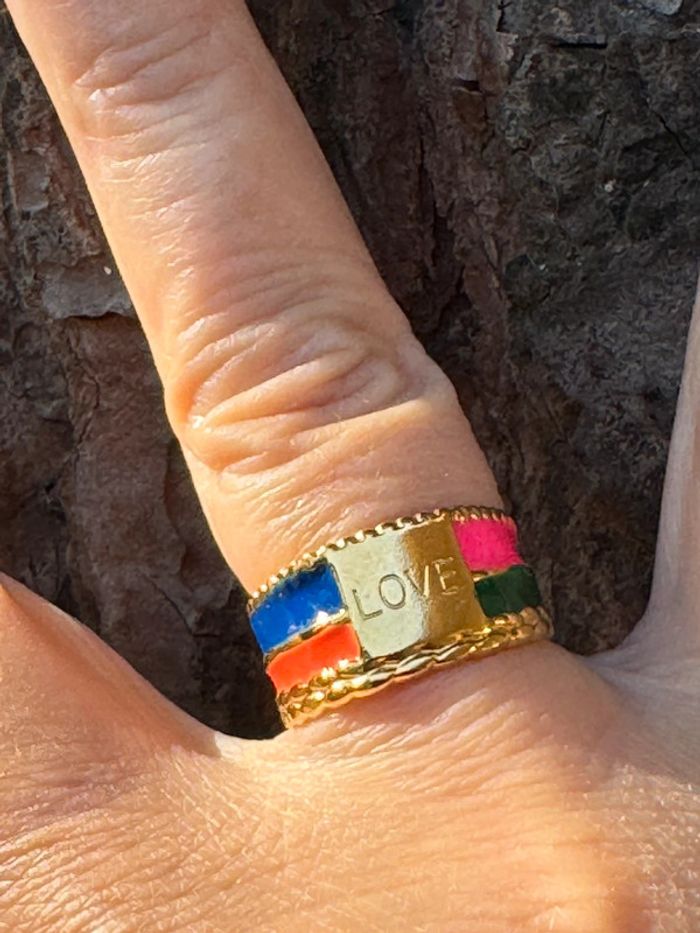 Bague gravée love réglable acier inoxydable or et résine multicolore réglable neuve dans pochon