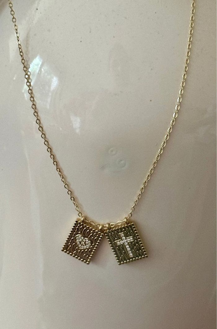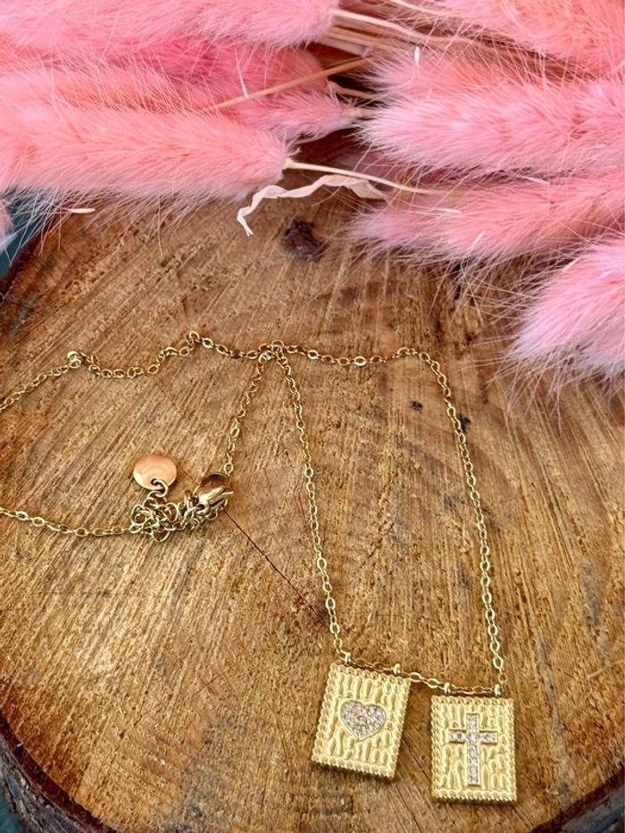 Collier chaîne réglable acier inoxydable or 2 médailles carrées cœur croix cristaux - photo numéro 1