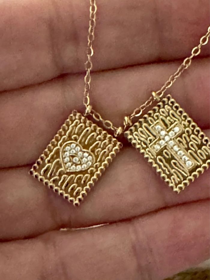 Collier chaîne réglable acier inoxydable or 2 médailles carrées travaillées cœur et croix cristaux neuf dans pochon