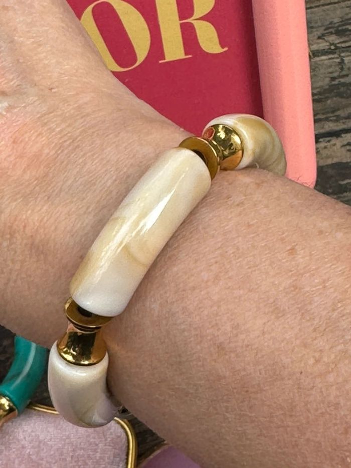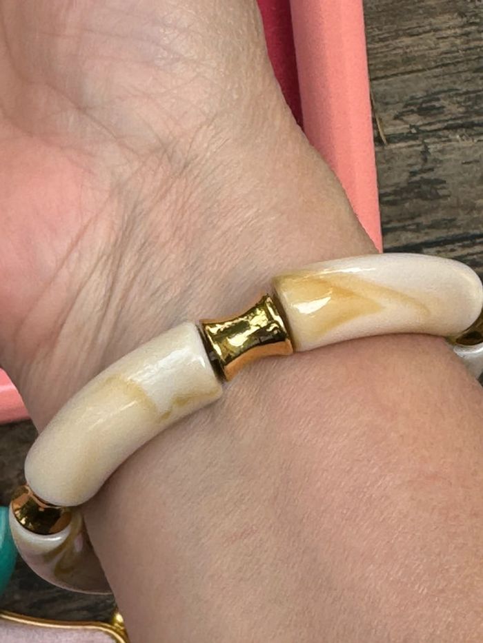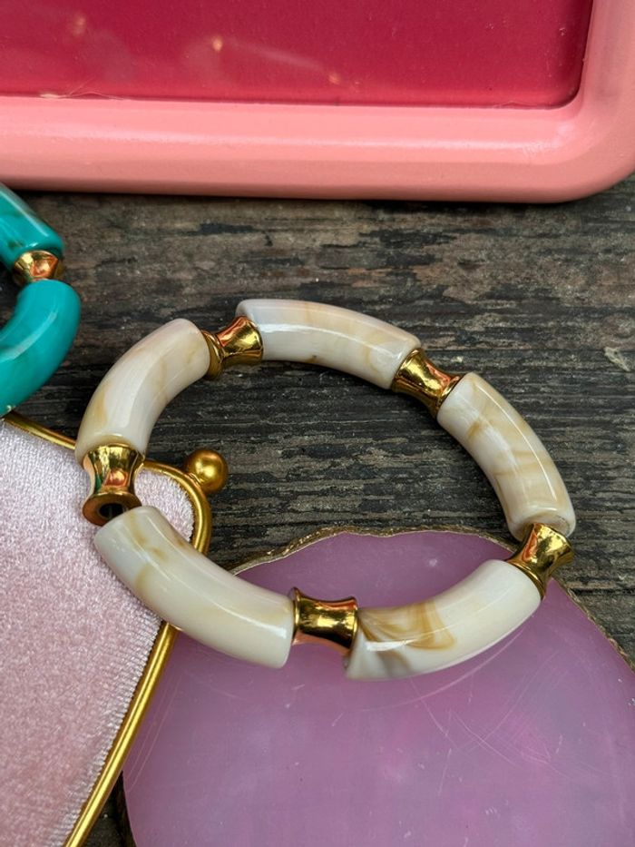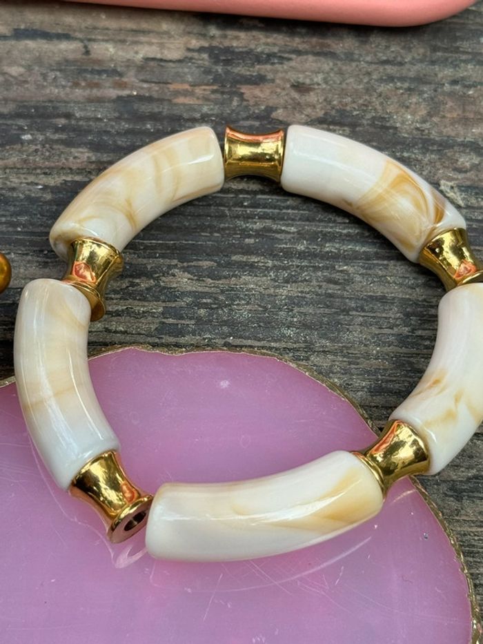 Jonc élastique réglable pièces résine rigide écrues avec des reflets brun et petites pièces or neuf sans pochon