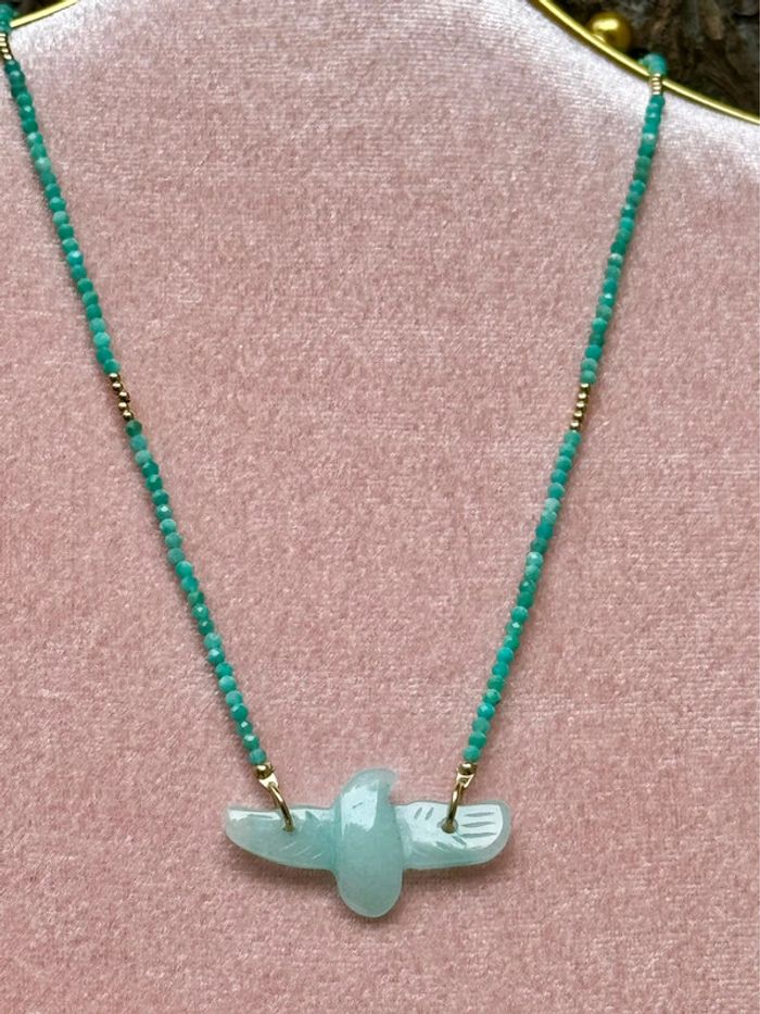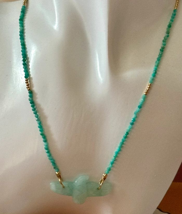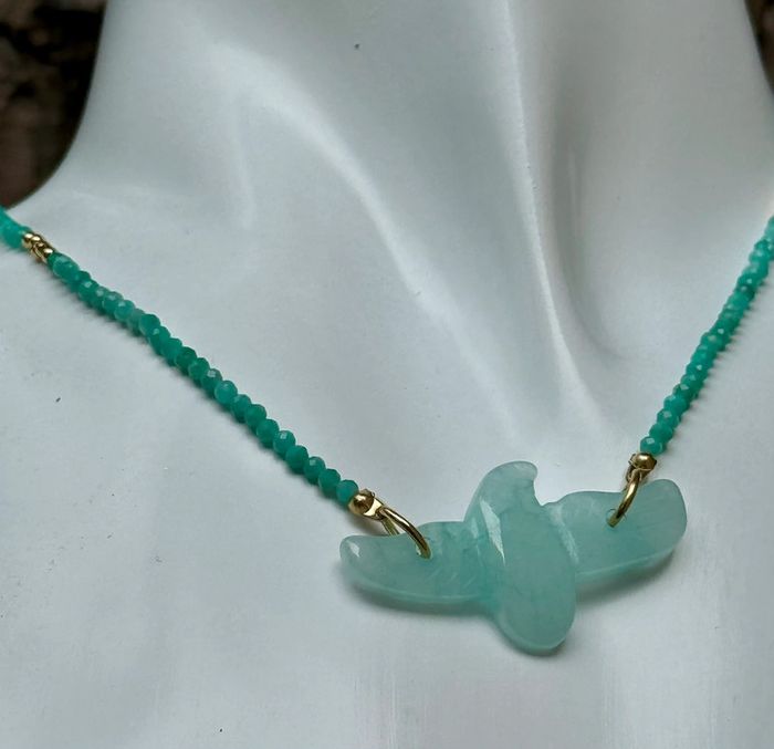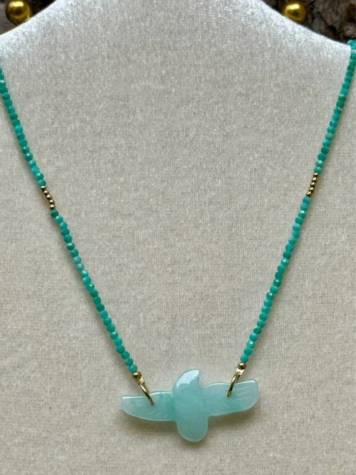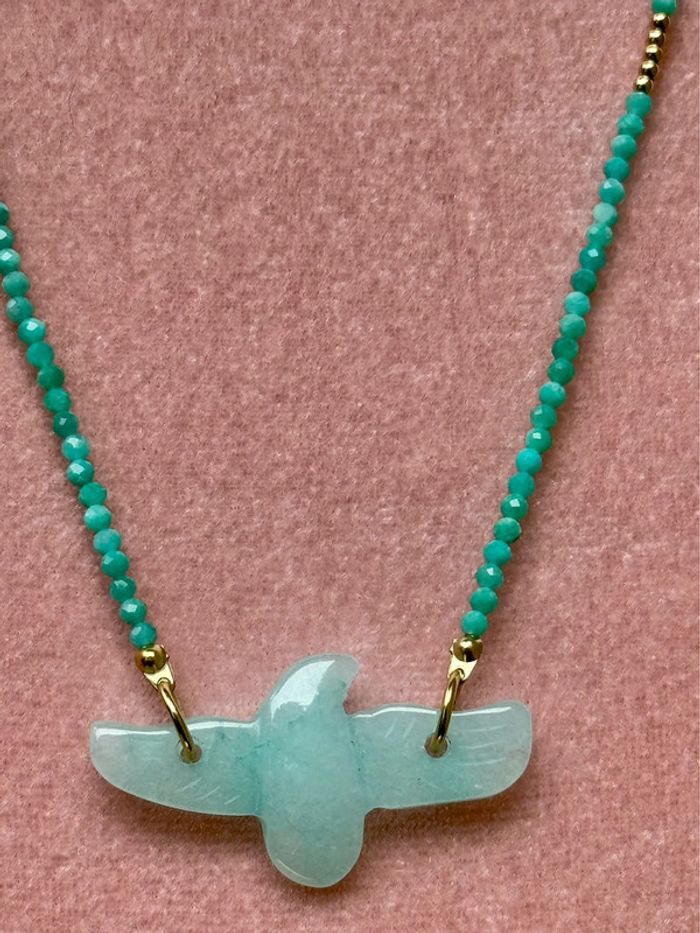 Collier réglable perles naturelles et aigle jade vert acier inoxydable or