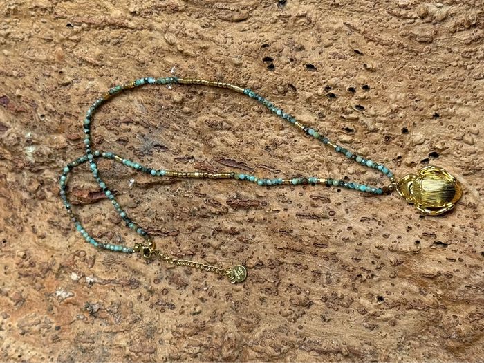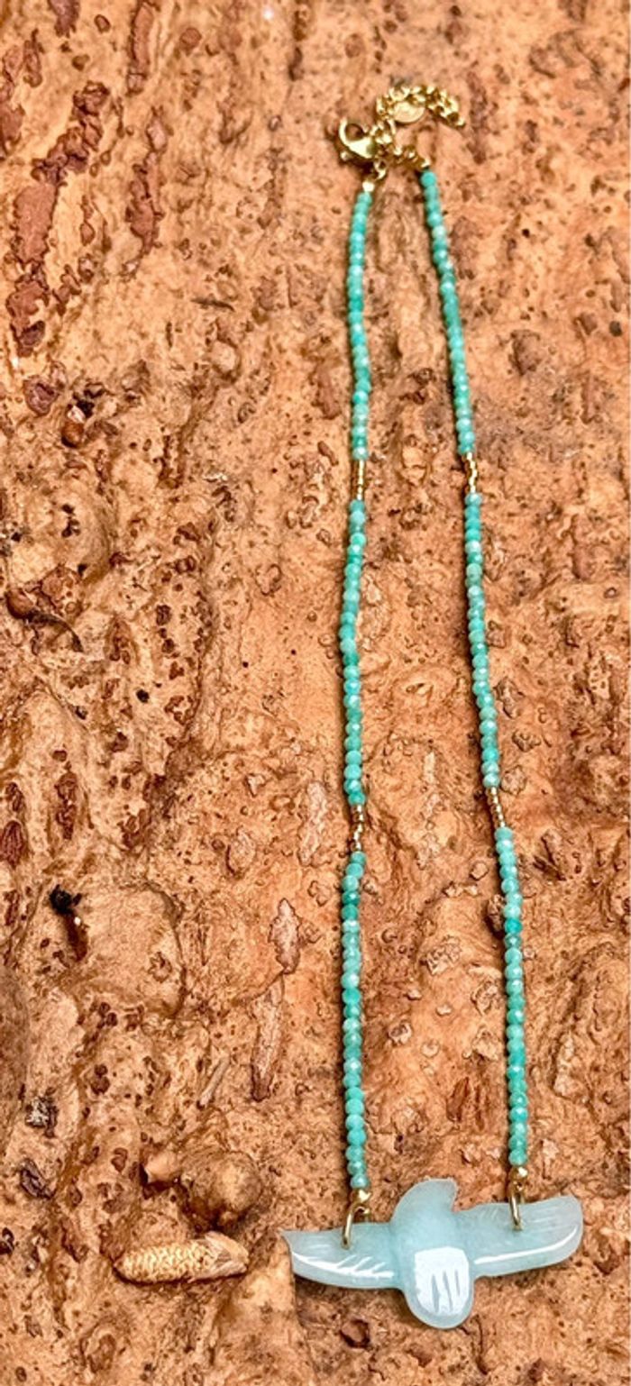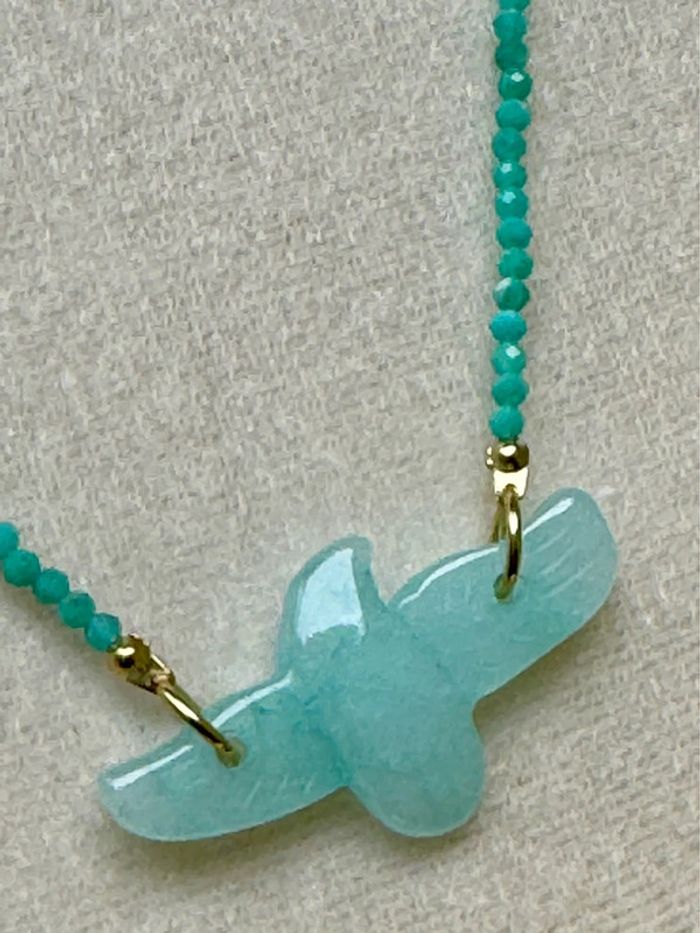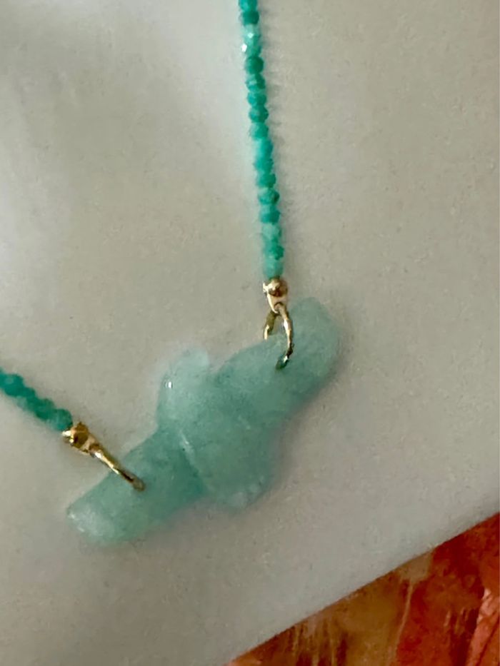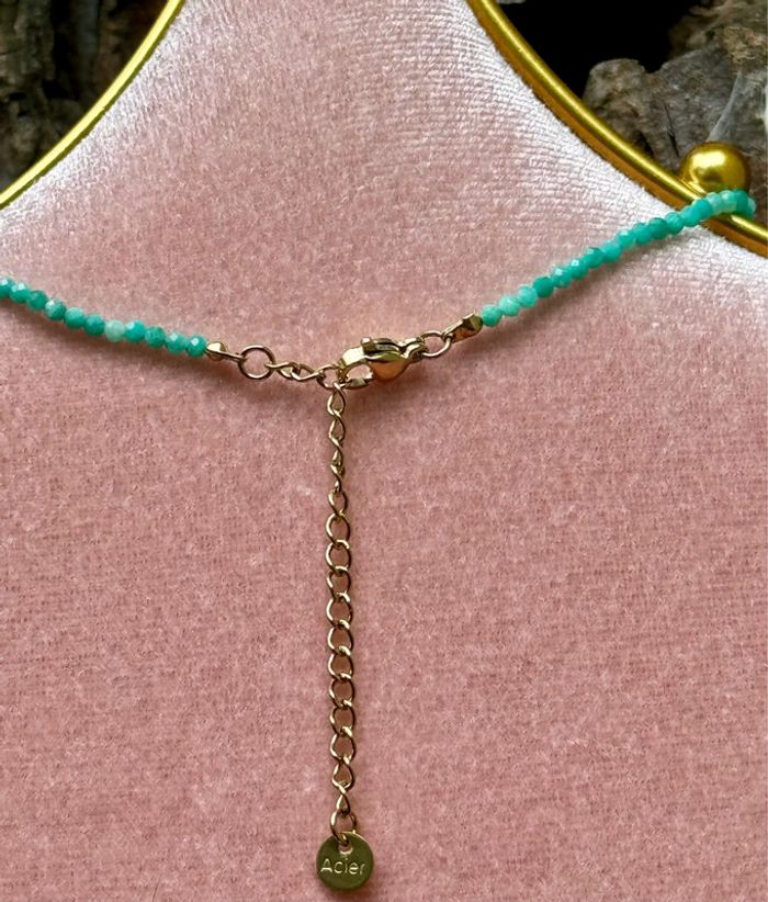 Collier réglable perles naturelles et aigle jade vert acier inoxydable or