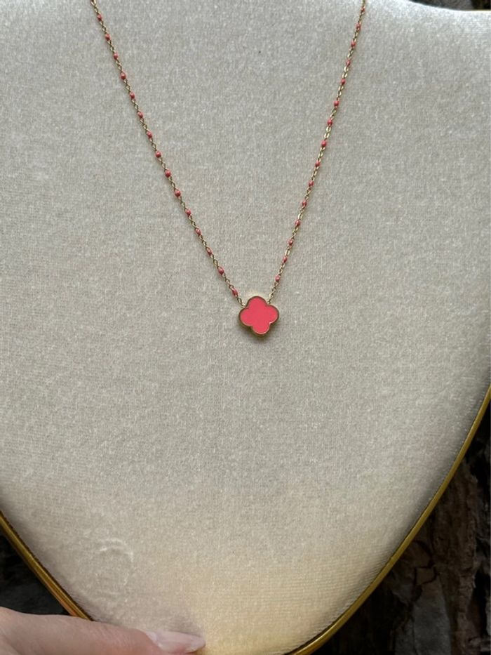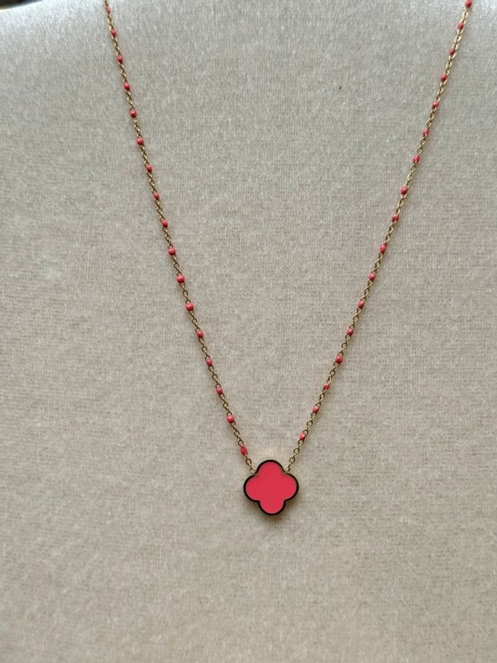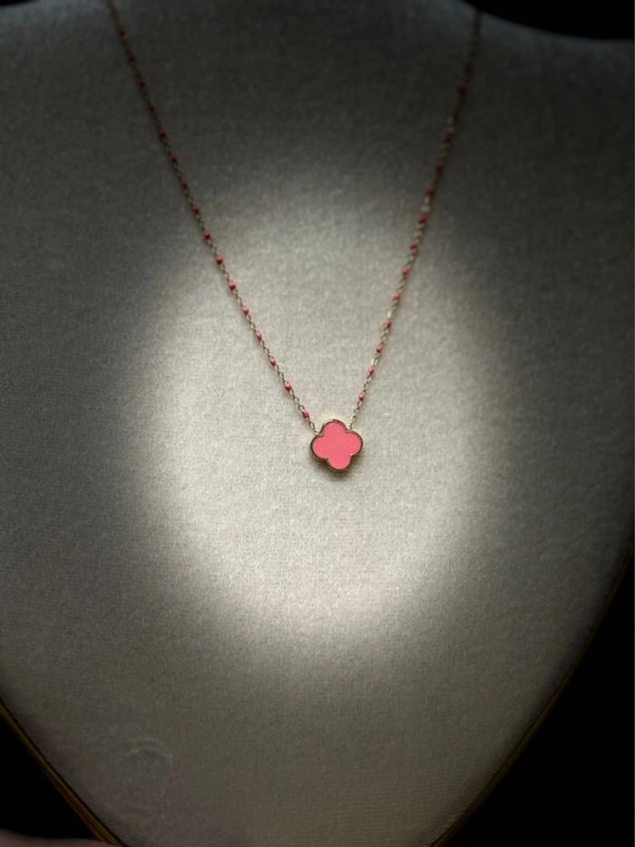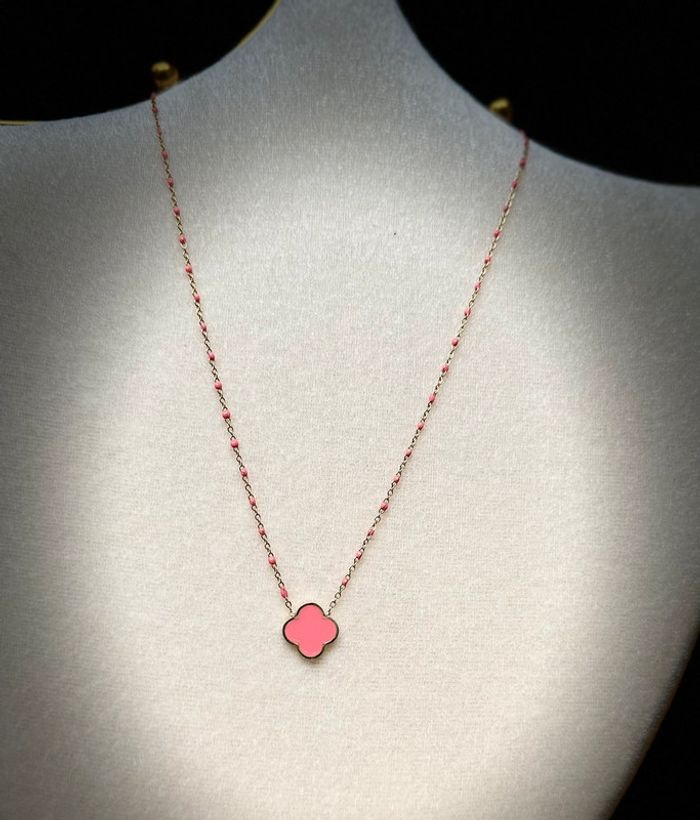 Collier perles résine et trèfle rose fjashy acier inoxydable or - photo numéro 1