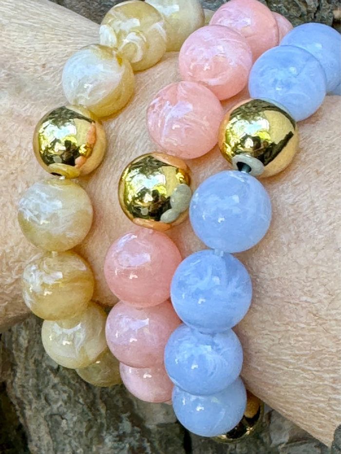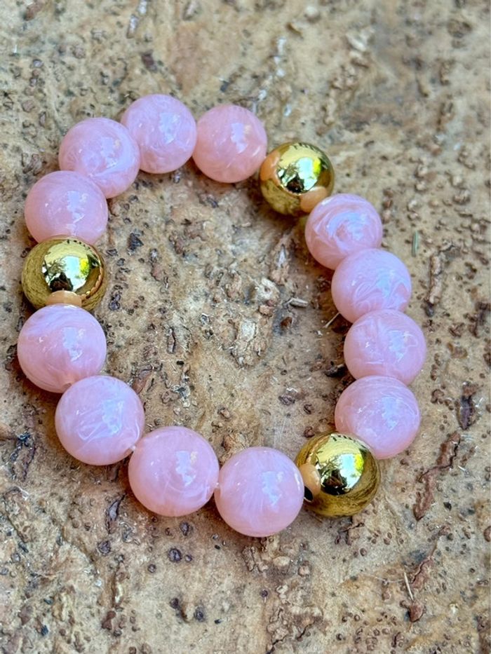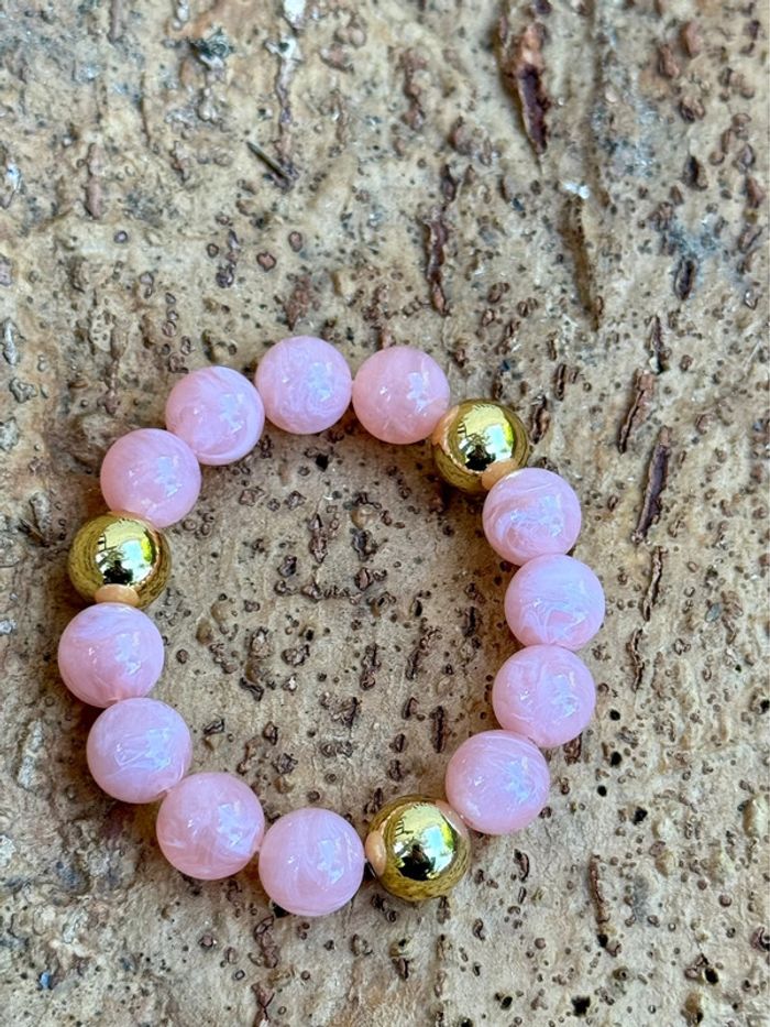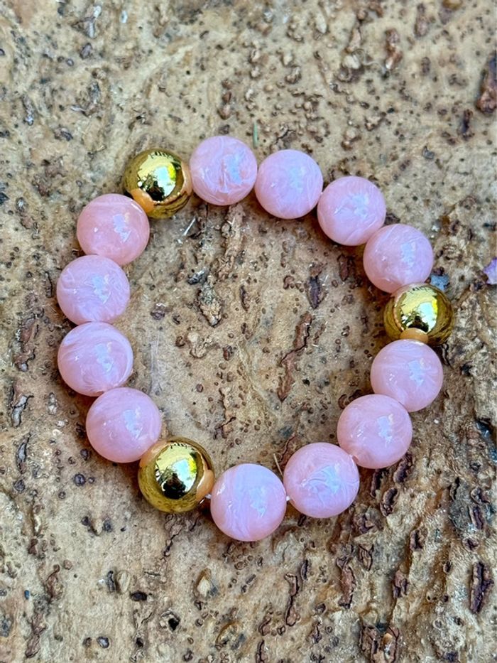 Bracelet élastique réglable grosses boules rosées avec des reflets et 3 boules or