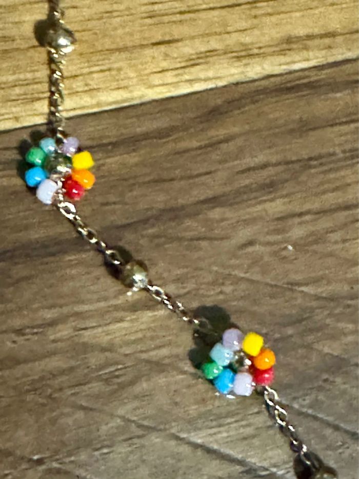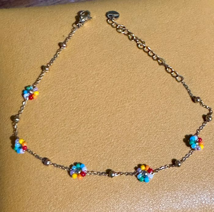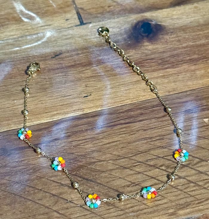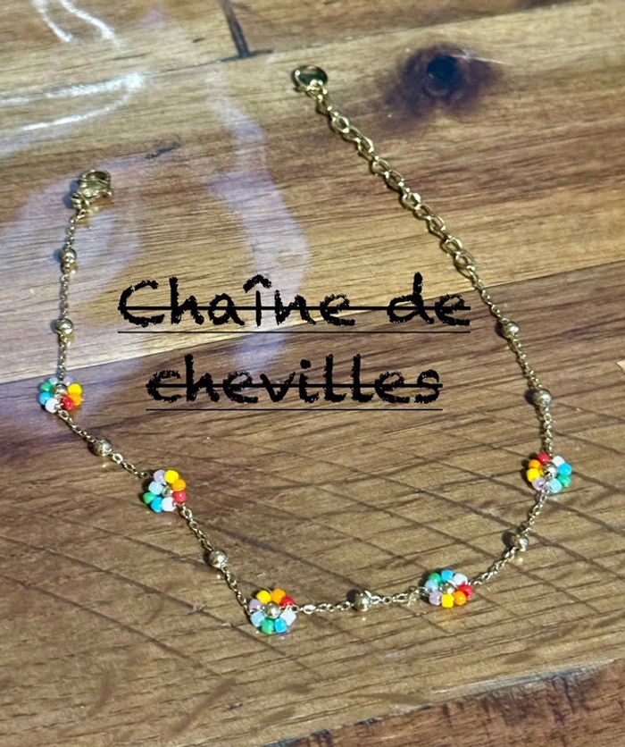 Chaîne de cheville réglable acier inoxydable or avec petites boules et fleurs perles couleurs neuf dans pochon