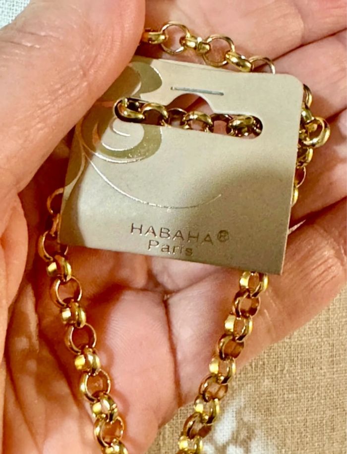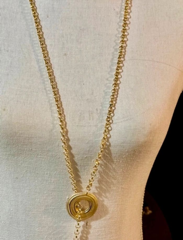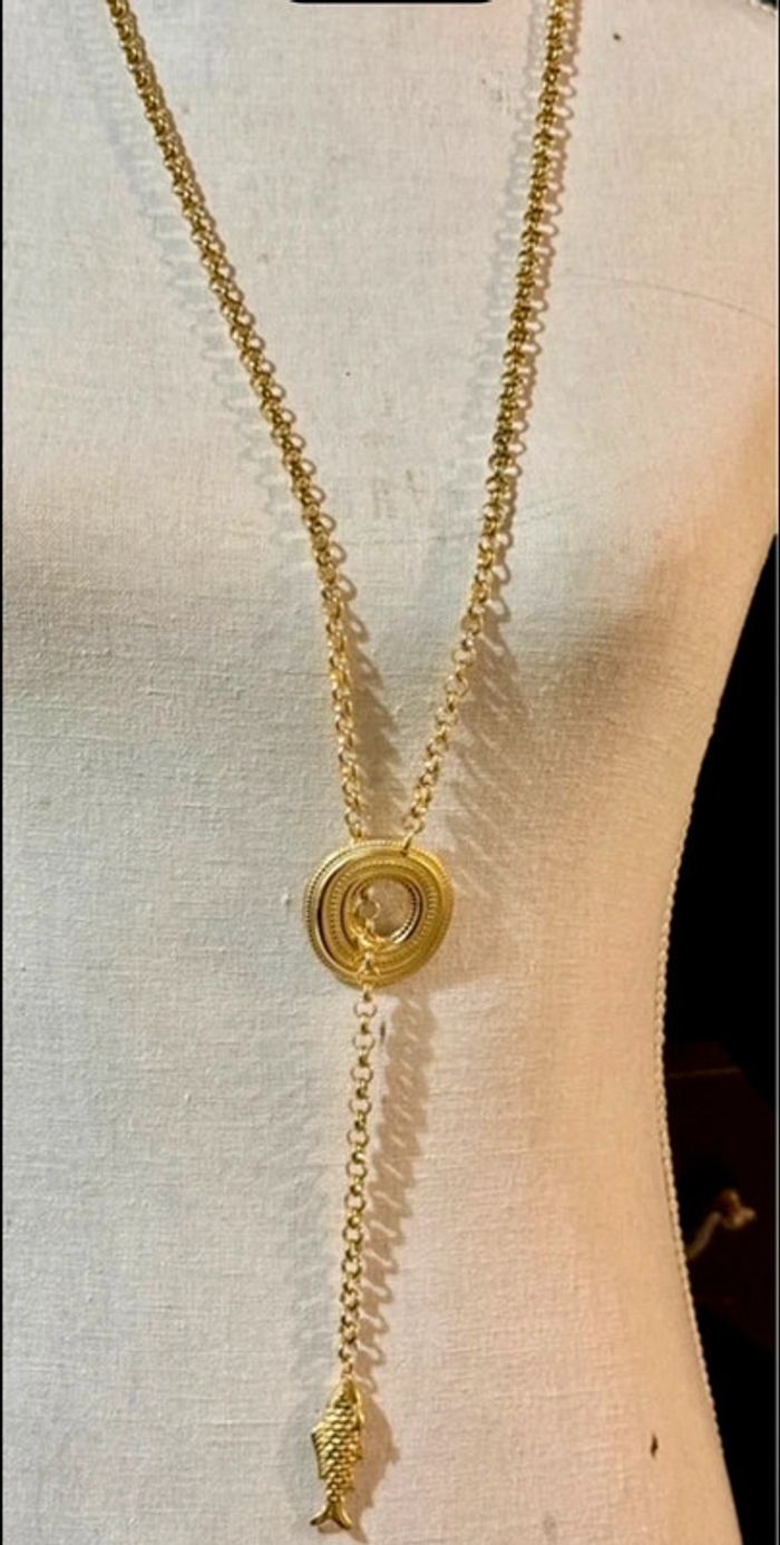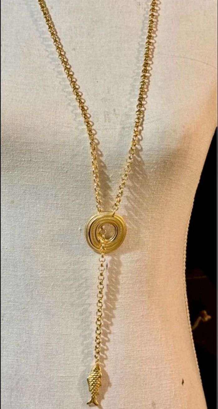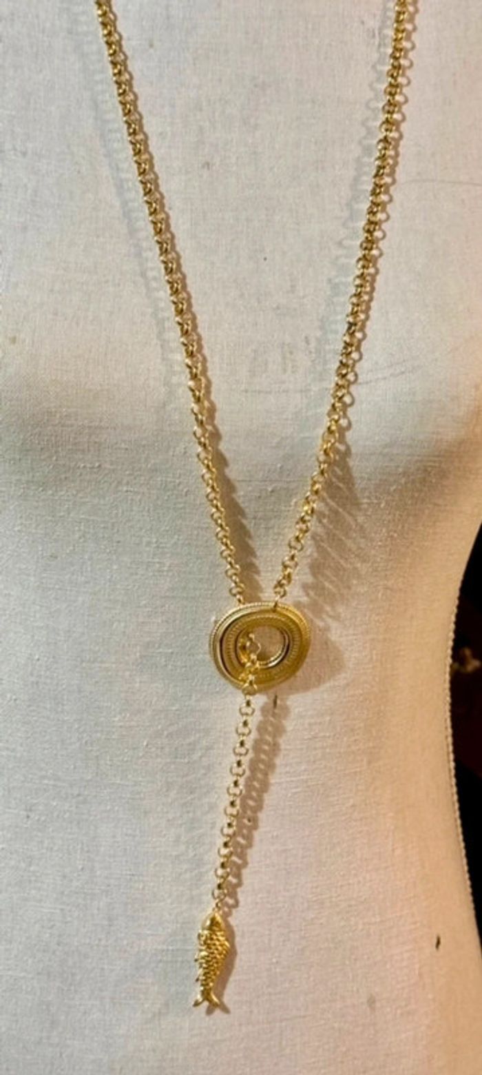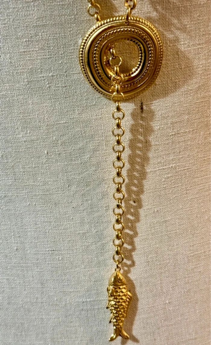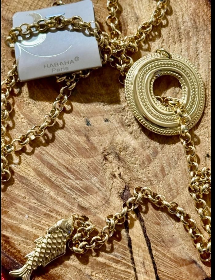 Superbe sautoir V chaîne épaisse cercle xl large et épais travaillé chaîne traversant poisson xl travaillé en finition marque HABAHA Paris neuf dans pochon