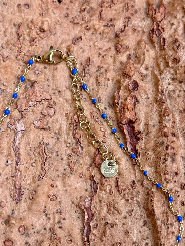 Collier chaîne réglable acier inoxydable or perles résine bleu petit zircon neuf dans pochon